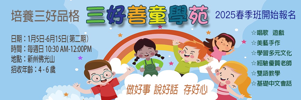 最新活動了解更多 2025/11/252026 春季班 三好善童學苑2025/05/122025 秋季班 三好善童學苑2025/11/252026 Spring Session Three Acts of Goodness Educati2025/11/25佛光山百萬人興學 盡形壽興學委員2025/11/112025年十二月行事曆 綜合新聞了解更多 2025/12/09勝鬘書院新州文化參學 深入體驗人間佛教實踐2025/11/17紐澤西佛光會歲末送暖 Publish出版品了解更多 查無資料 No data 法會訊息了解更多 2025/11/24彌陀法會 12/21/2025 10:00am- 5:30pm2025/09/302025 藥師法會 11/16/2025 10:00am - 4:00pm2025/07/088/31/2025 孝道月孝親報恩法會2025/03/042025 清明孝親報恩法會 4/6/2025 9:30AM2025/05/136/15/2025 大悲懺法會 新聞回顧了解更多 新州佛光⼭三好善童學苑 品德教育成⻑茁壯新州佛光山義工品茶悟禪新州佛光人以「三好」展現勞動節遊行主題紐澤西佛光會 關懷清寒學童洪蘭教授新州開講 改變⼼態 改變⽣命蔬食接龍 歡樂滿人間新州三好善童學苑 讓明天會更好身体力行,润物如春风 - 2025北美佛光知宾培训心得