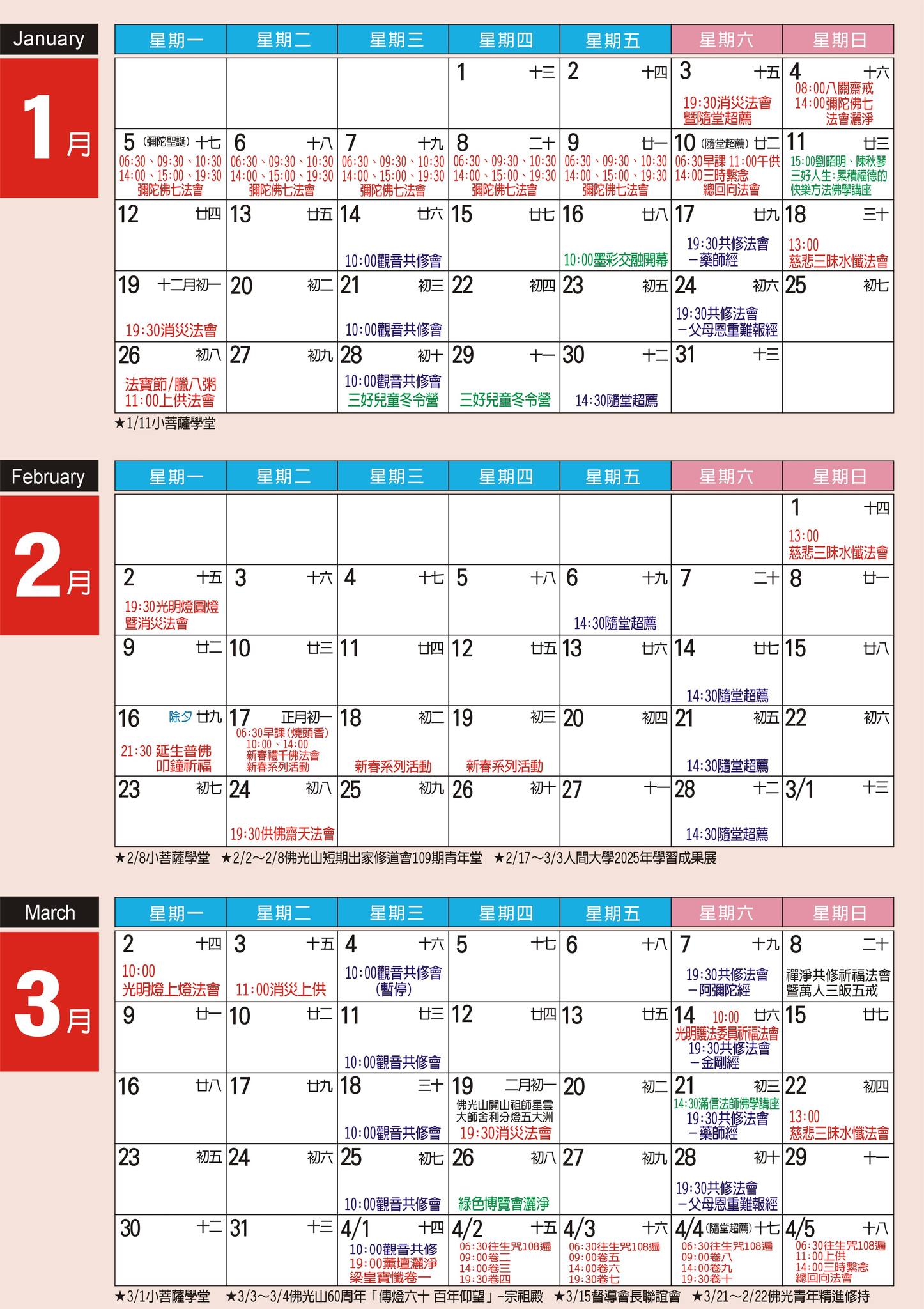 近期活動首頁活動訊息近期活動 2025/12/15 posted2026 腊八粥結緣暨養生健康活動2025/12/18 posted2026 年 1-3 月行事曆2025/11/20 posted佛光山蘭陽別院 佛學講座2025/11/20 posted佛光山蘭陽別院 2026 八關齋戒-元月份2025/09/10 posted2025年10-12月行事曆2023/11/29 posted佛光文化的Podcast節目『禪悅之聲』 觀看活動回顧