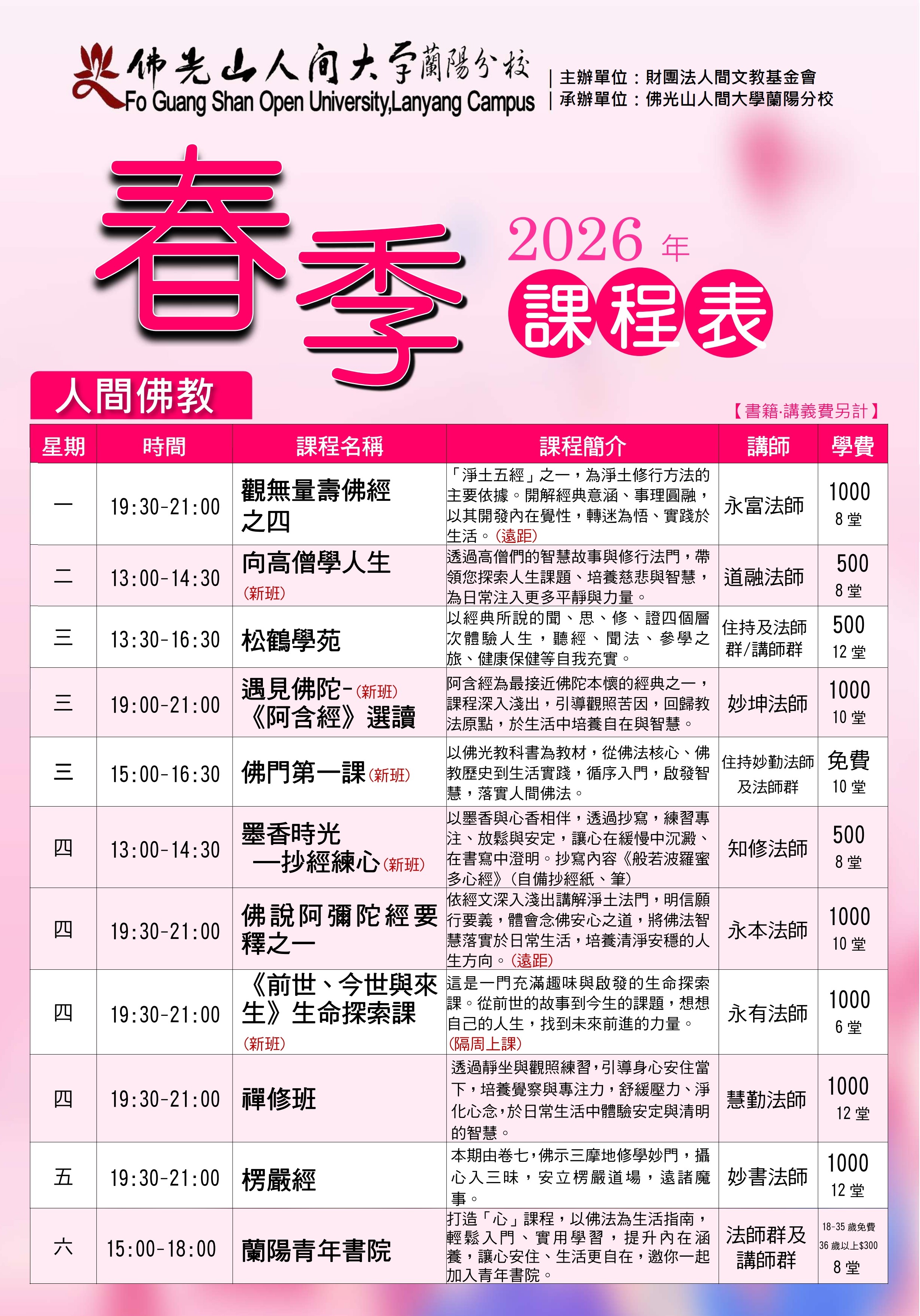 最新活動首頁了解更多最新活動 2026/01/01 posted人間大學蘭陽分校|2026 春季班 新班招生中2025/09/03 posted兒童潛能系列2025/09/03 posted蘭陽佛光童軍團2025/12/15 posted2026 腊八粥結緣暨養生健康活動2025/09/03 posted舞蹈系列課程2025/09/03 posted中國繪畫系列2026/01/15 posted佛光緣美術館宜蘭館 詹惠美「墨彩交融」2025/12/28 posted佛光山蘭陽別院2026佛學講座2025/12/18 posted2026 年 1-3 月行事曆2025/11/20 posted佛光山蘭陽別院 2026 八關齋戒-元月份2025/09/03 posted音樂系列2025/09/03 posted運動健康系列2025/09/03 posted花藝設計系列2025/09/03 posted語言學習系列 回首頁