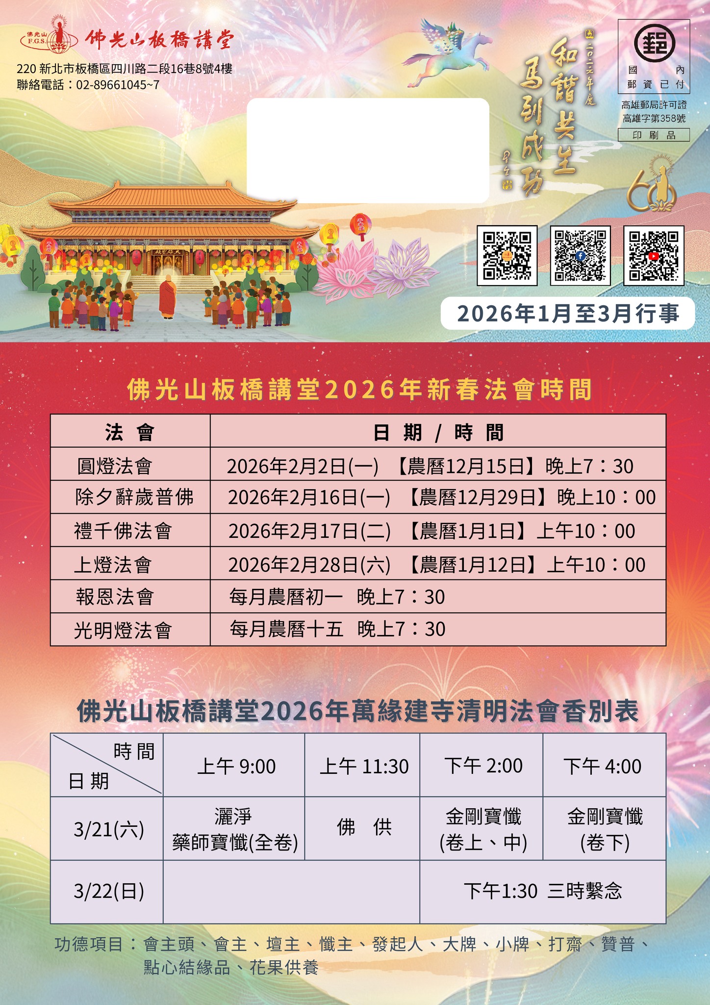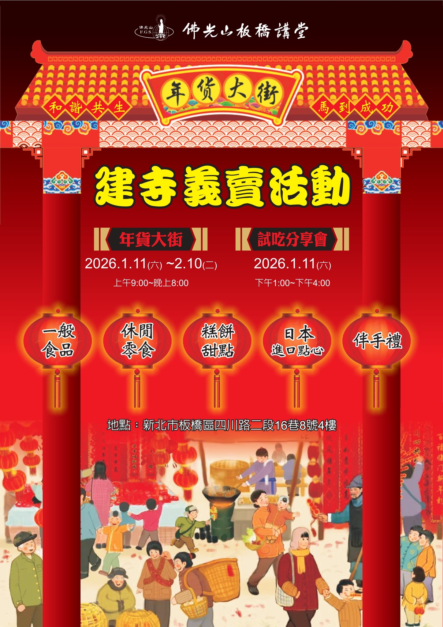 近期活動首頁活動訊息近期活動 2025/12/20 posted🌸【板橋講堂2026年1–3月精彩行事曆】🌸2025/12/18 posted2025板橋講堂社教成果SHOW-以藝修心2025/12/18 posted🎉 2026板橋講堂慶祝法寶節-臘八粥結緣活動 🎉2025/12/18 posted2026板橋講堂建寺義賣「年貨大街」開跑🤩✨!2025/12/08 posted2026板橋講堂春季社教班,歡迎報名2025/11/02 posted國光國小生命教育講座 實踐三好創造幸福2025/08/21 posted佛光山板橋講堂【2025年藥師法會】2025/08/21 posted板橋講堂10-12月行事曆2025/07/01 posted板橋講堂暑期課程2025/07/01 posted板橋講堂佛學講座-佛法其實很懂你的心2025/06/22 posted板橋講堂安樂富有講座 學習AI時代的教養觀2025/06/22 posted佛光山板橋講堂《大悲懺法會》🙏⏰2025/06/22 posted佛光山板橋講堂〈佛學講座〉2025/06/08 posted板橋講堂7-9月行事曆2025/06/08 posted🤩「小菩薩大跟班」兒童夏令營2025/06/05 posted2025年板橋講堂秋季社教班課程2025/11/02 posted樂齡心活力、幸福不打烊👴👵💪2025/10/03 posted板橋義工集結救援 災後重建光復鄉村2025/10/03 posted板橋佛光青年團花蓮光復鄉協助災後清理2025/09/01 posted板橋講堂開講「真愛.適時放手」從善生到善終2025/09/01 posted板橋講堂佛學講座 佛法其實很懂你的心2025/08/21 posted佛光山板橋講堂孝道月梁皇法會2025/08/21 posted板橋青年與法相會 叢林座談共話智慧2025/07/07 posted2025.7.3 兒童夏令營佛光山巡山趣2025/06/22 posted佛光山板橋講堂〈佛學講座〉2025/06/22 posted佛光山板橋講堂〈佛學講座〉 觀看活動回顧