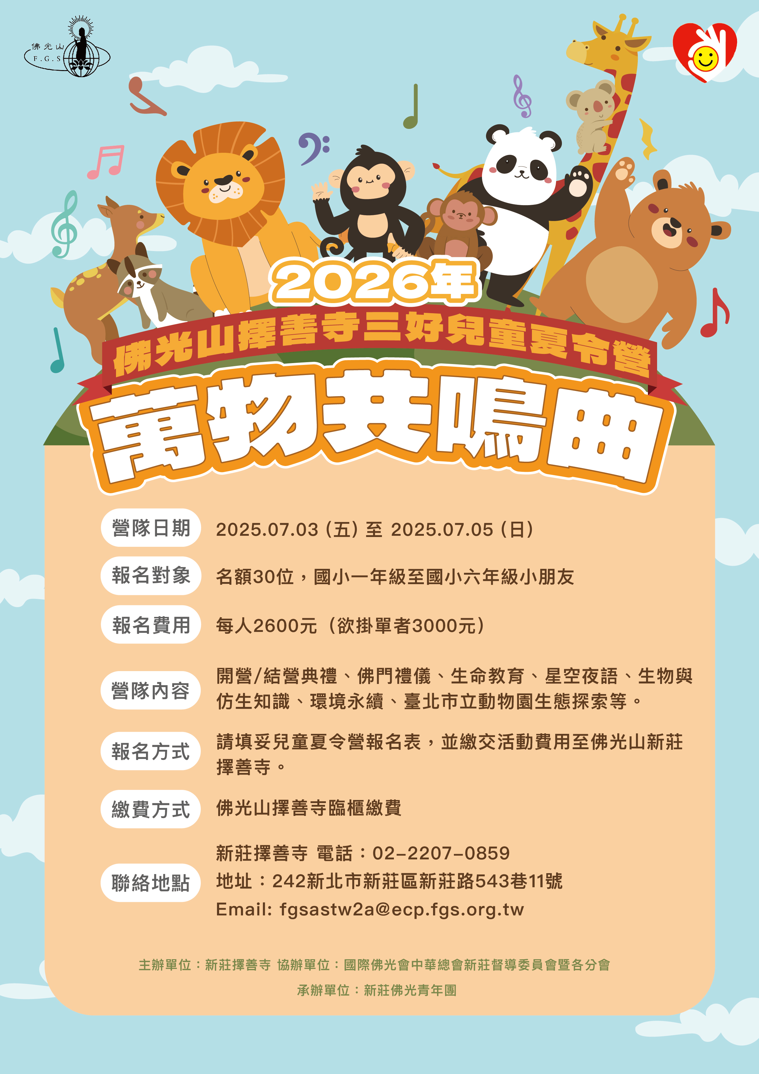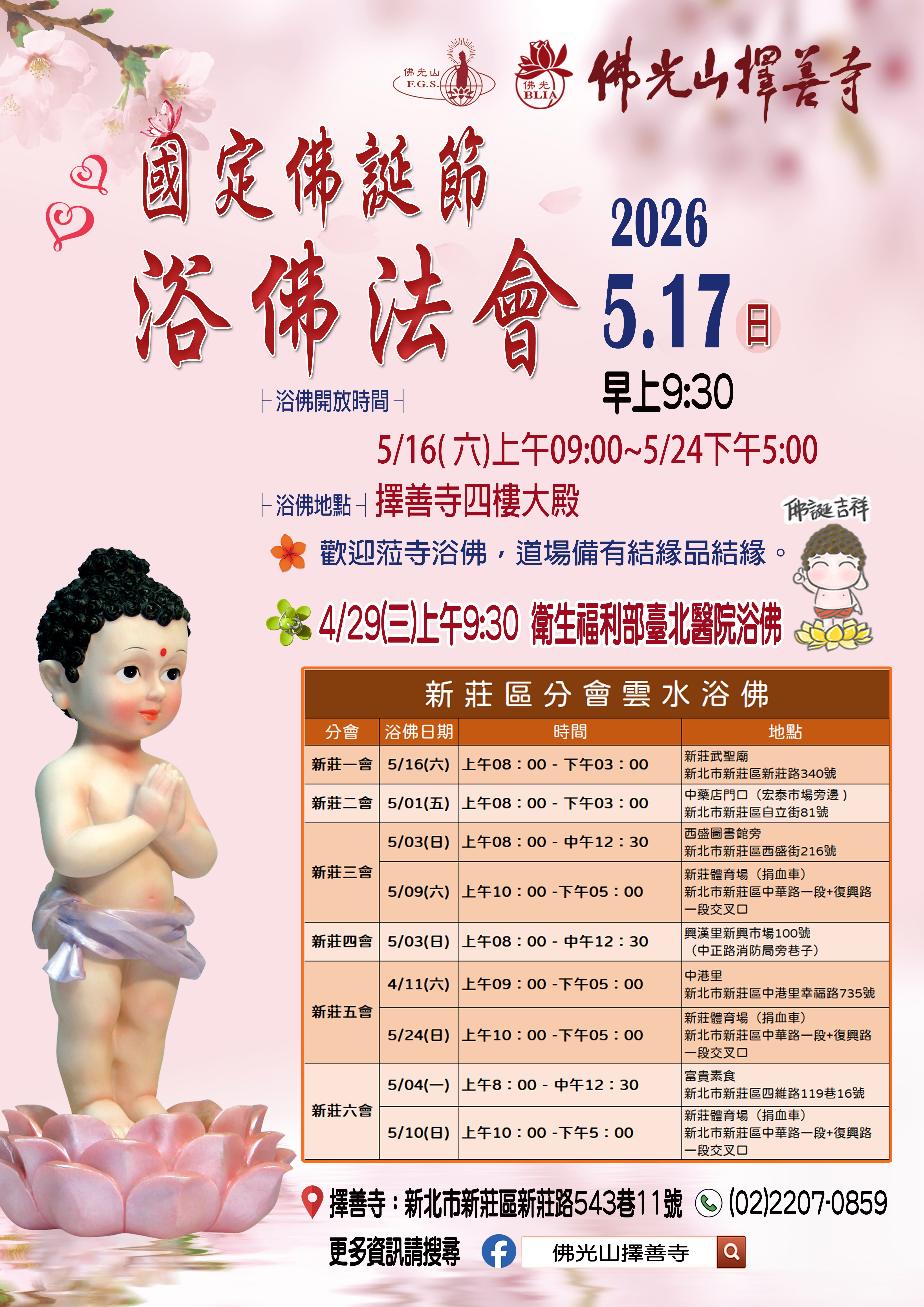 近期活動首頁活動訊息近期活動 2026/04/20 posted2026擇善寺.新莊區佛光會雲水浴佛活動2026/04/20 posted🌟2026年佛光山擇善寺三好兒童夏令營🌟🎵《萬物共鳴曲》熱情招生中!2026/03/14 posted擇善寺佛學講座-圓滿生命的教育-慧昭法師2025/12/16 posted👍佛光山擇善寺2026年1-3月行事曆出爐了👏👏2025/09/22 posted👍佛光山擇善寺2025年10-11月行事曆出爐了👏👏 觀看活動回顧