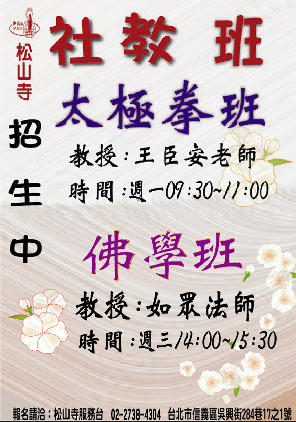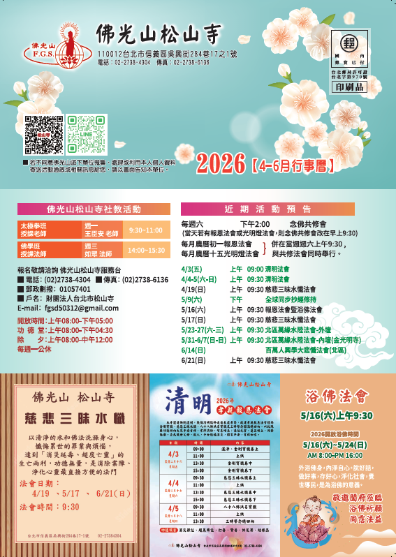 近期活動首頁活動訊息近期活動 2026/01/13 posted2026清明孝親報恩法會2026/01/30 posted2026/03/08萬人甘露灌頂三皈五戒禮2025/12/29 posted2026/03大悲懺法會2026/02/25 posted2026/04-5-6之通啟2026/02/15 posted2026春季社教班2026/01/13 posted2026佛光山春節平安燈會2025/12/04 posted2026第一季通啟2024/08/22 posted松山寺地址-電話-劃撥帳號2025/05/16 posted松山寺各項功德登記,均採現場登記,勿上當受騙 觀看活動回顧