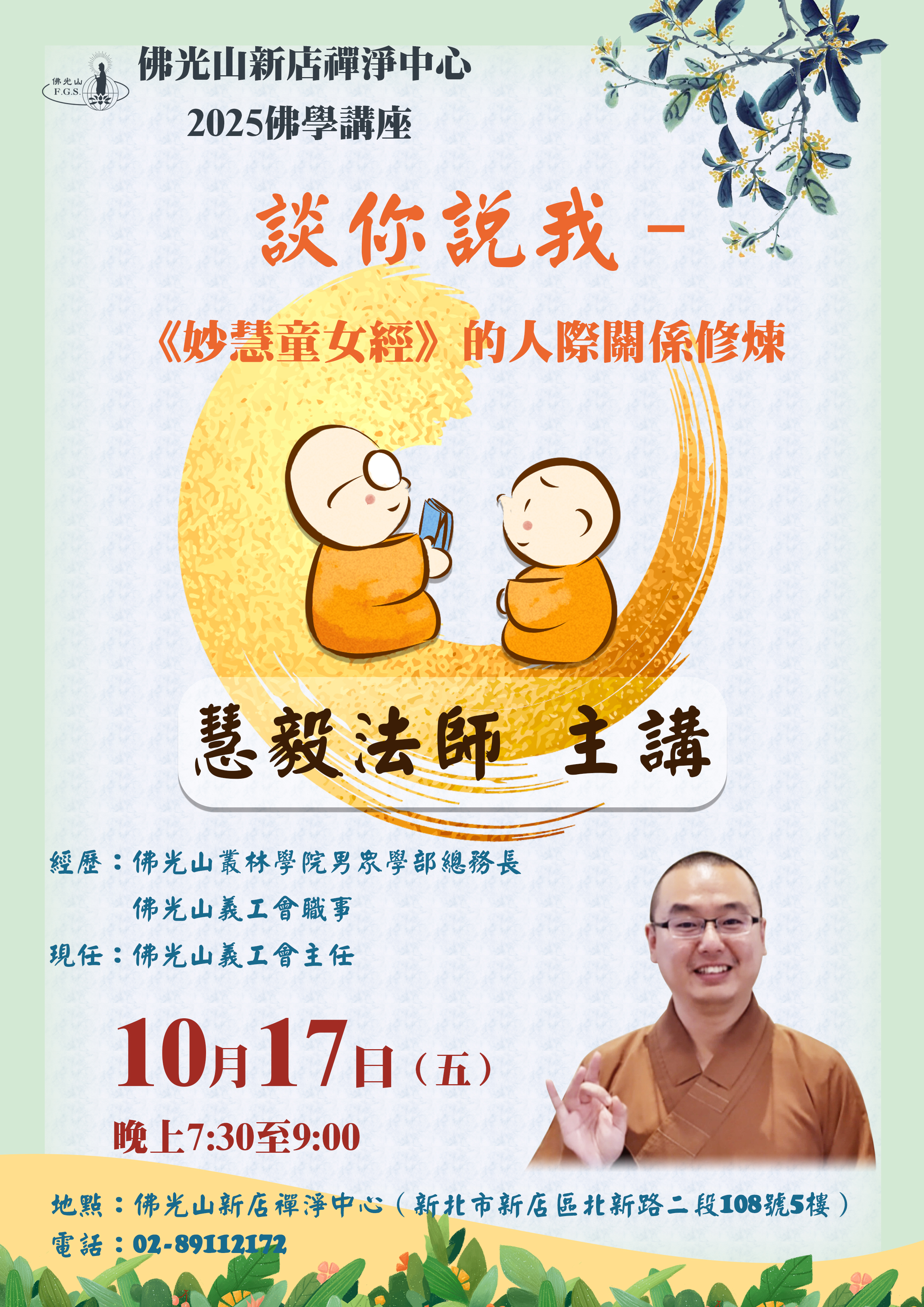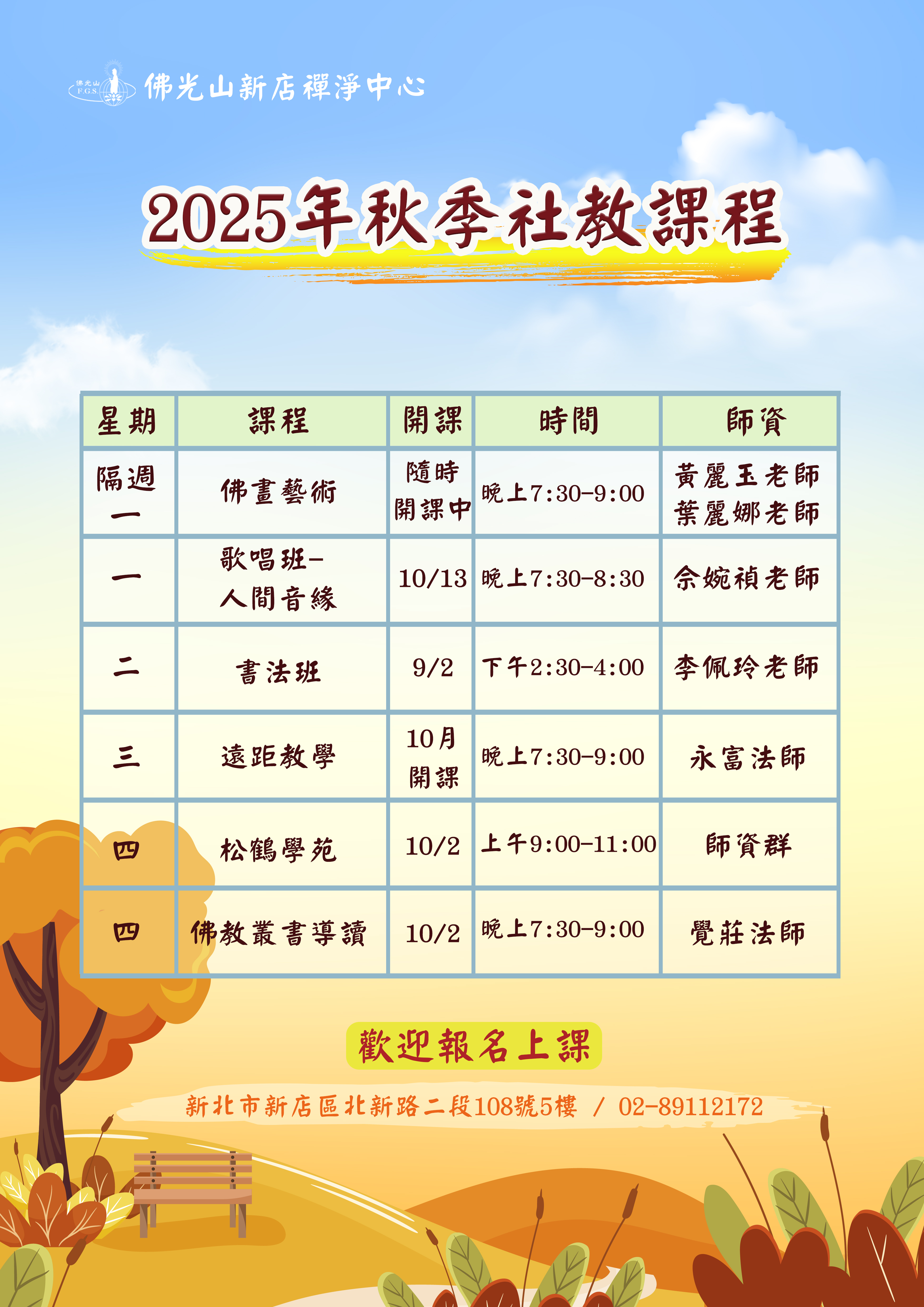 最新活動首頁了解更多最新活動 2025/09/23 posted2025秋季社教課程2025/10/17 posted2025/10/17 佛學講座:《妙慧童女經》的人際關係修煉2025/09/09 posted2025 年 10~12 月 行事曆 回首頁