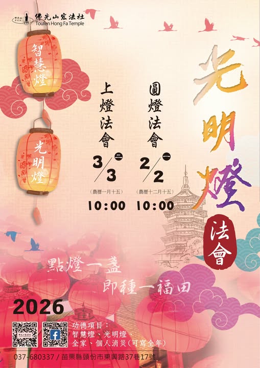 最新活動首頁了解更多最新活動 2026/01/01 posted宏法社 2026年 01~03月 行事曆2026/02/01 posted宏法社 2026年 福報法會2026/01/01 posted宏法社 2026年 光明燈 回首頁