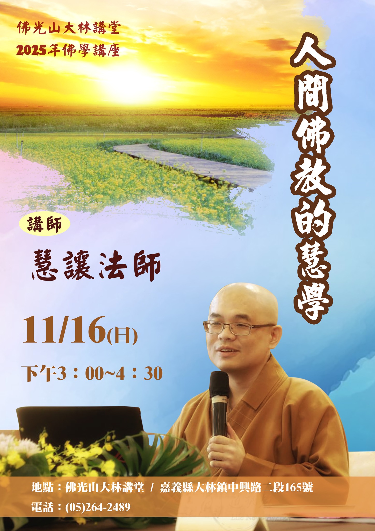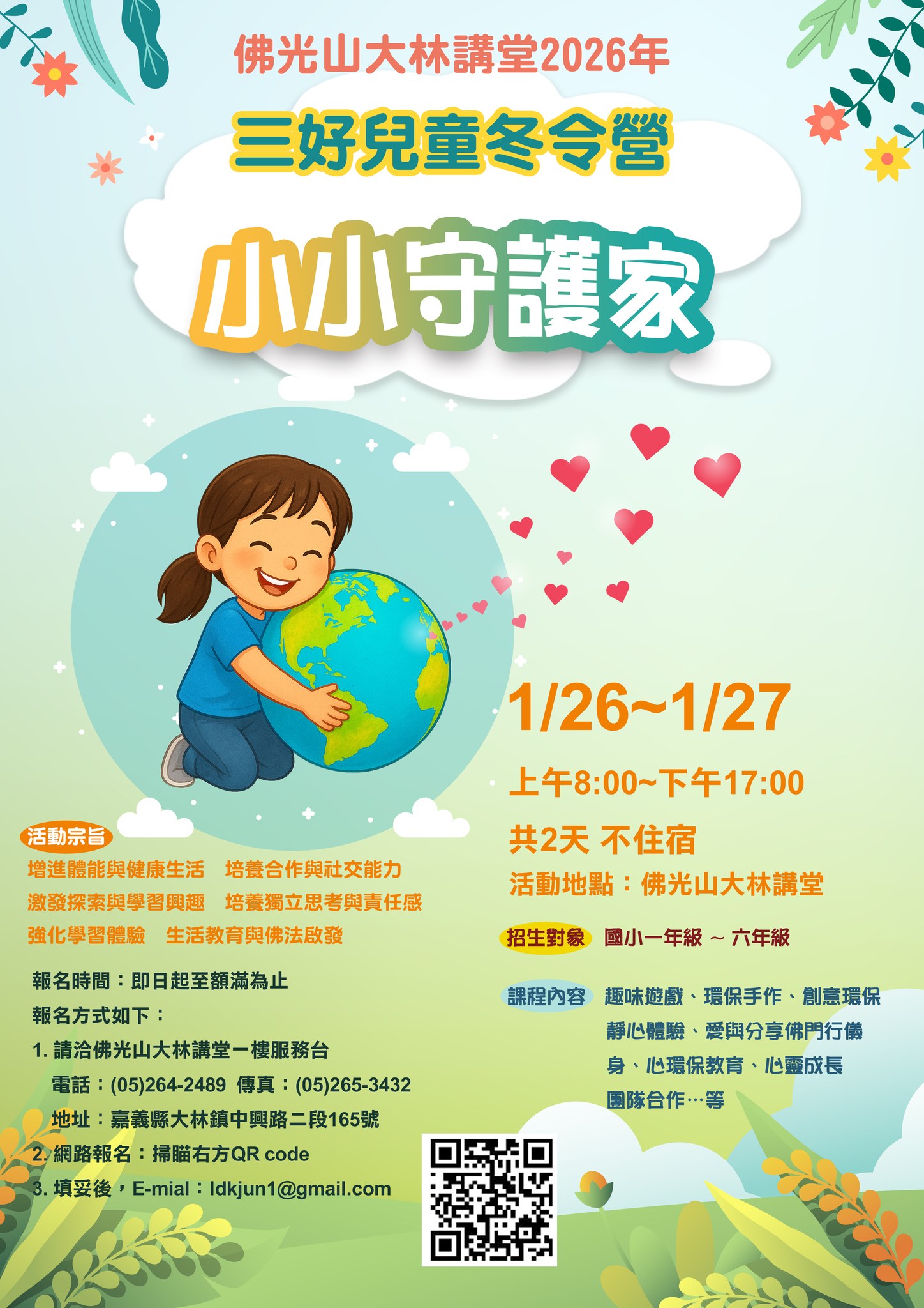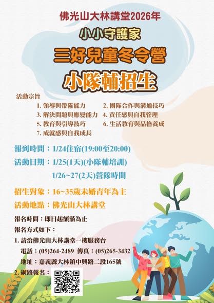 最新活動首頁了解更多最新活動 2025/11/07 posted大林講堂11月份佛學講座 11/16(日) 下午15:00至16:302025/11/07 posted大林講堂2026年(小小守護家)三好兒童冬令營1/26-1/27共2天,不住宿2025/11/07 posted大林講堂2026(小小守護家)三好兒童冬令營1/25(培訓) 1/26~27(營隊時間 )2025/02/10 posted佛光山大林書院 招 生(即日起) 回首頁