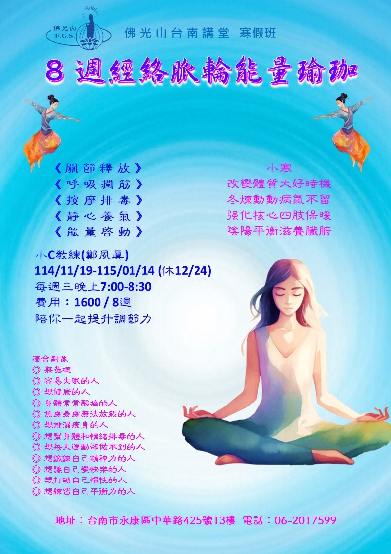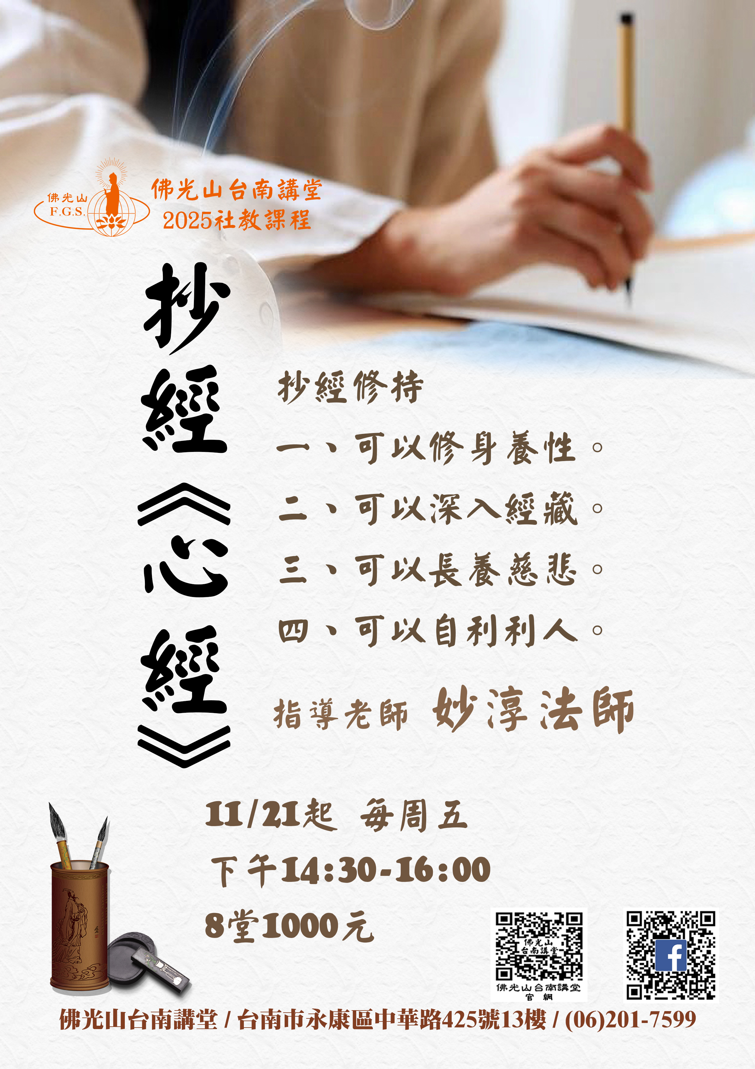 最新活動首頁了解更多最新活動 2025/07/27 posted2025秋季班課程招生中2025/10/22 posted8週經絡脈輪能量瑜珈 招生中2025/10/20 posted抄經《心經》班招生中2025/09/24 posted2025秋季工筆佛畫招生中2025/09/05 posted2025年秋季班 敦煌禪舞 招生中2025/08/14 posted遠距教學 佛說阿彌陀經 要釋 招生中2025/08/14 posted2025秋季班 成人書法 招生中2025/08/12 posted2025秋季班 初階書法招生中2025/07/27 posted9/5陶藝手作 秋季班招生中2025/07/23 posted10/2 人間生活禪 招生中2025/07/22 posted10/18 正念茶禪 招生中2025/07/22 posted9/26頌缽靜心 招生中2025/05/31 posted台南佛光童軍團 招生中2025/03/11 posted2025年大台南區三皈五戒開始報名了!2025/03/11 posted2025年3月17日書瀹茶禪招生中2025/03/15 posted3/22 佛光有愛 邀您捐血 回首頁