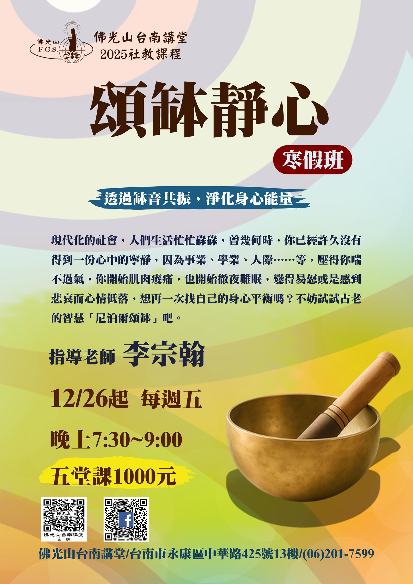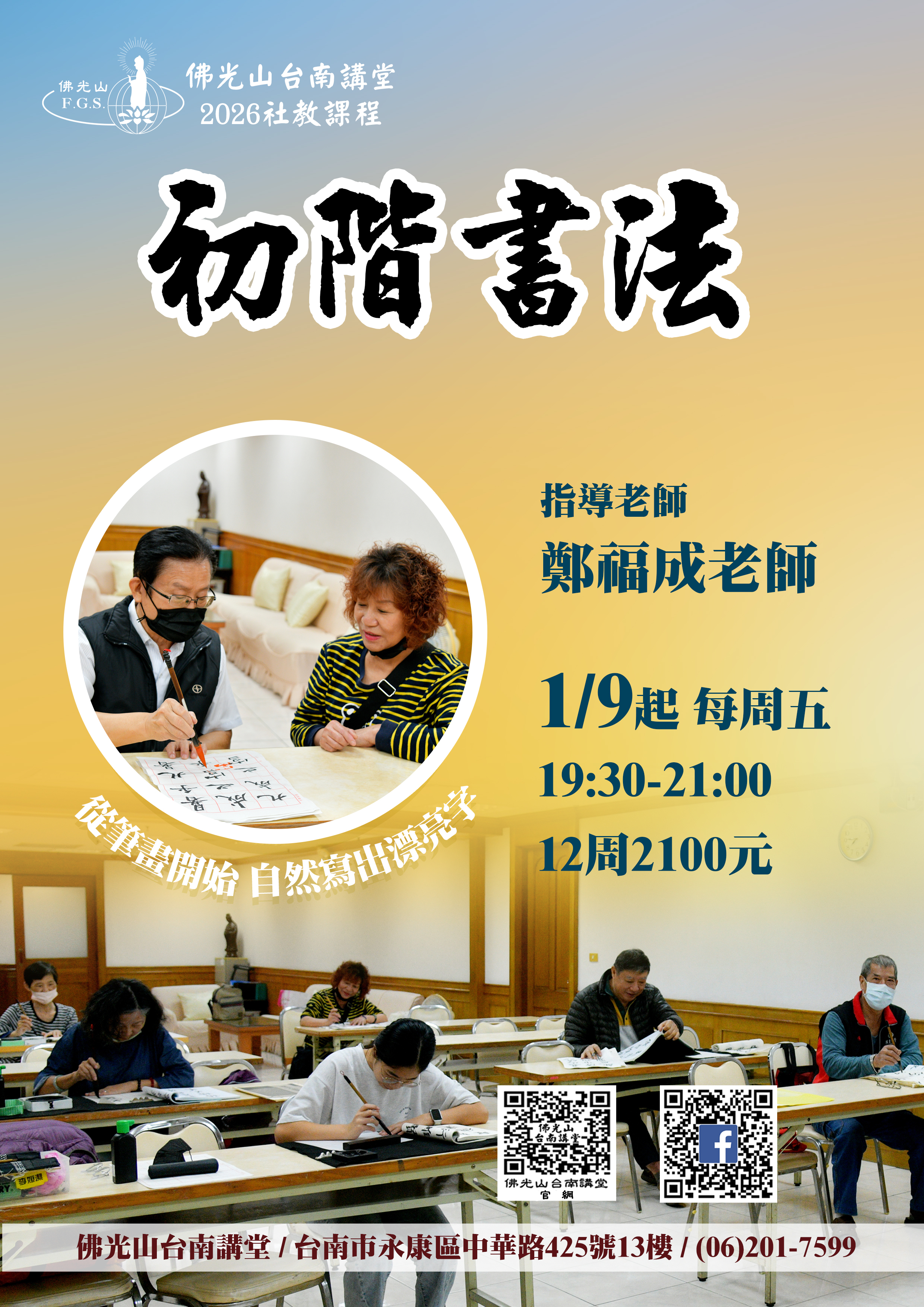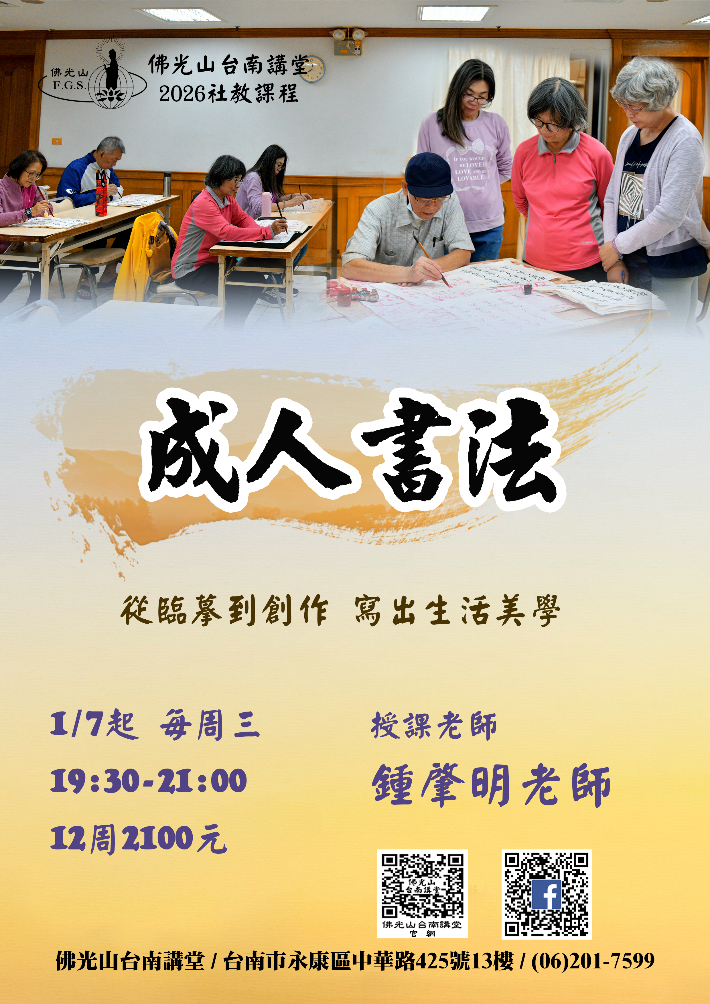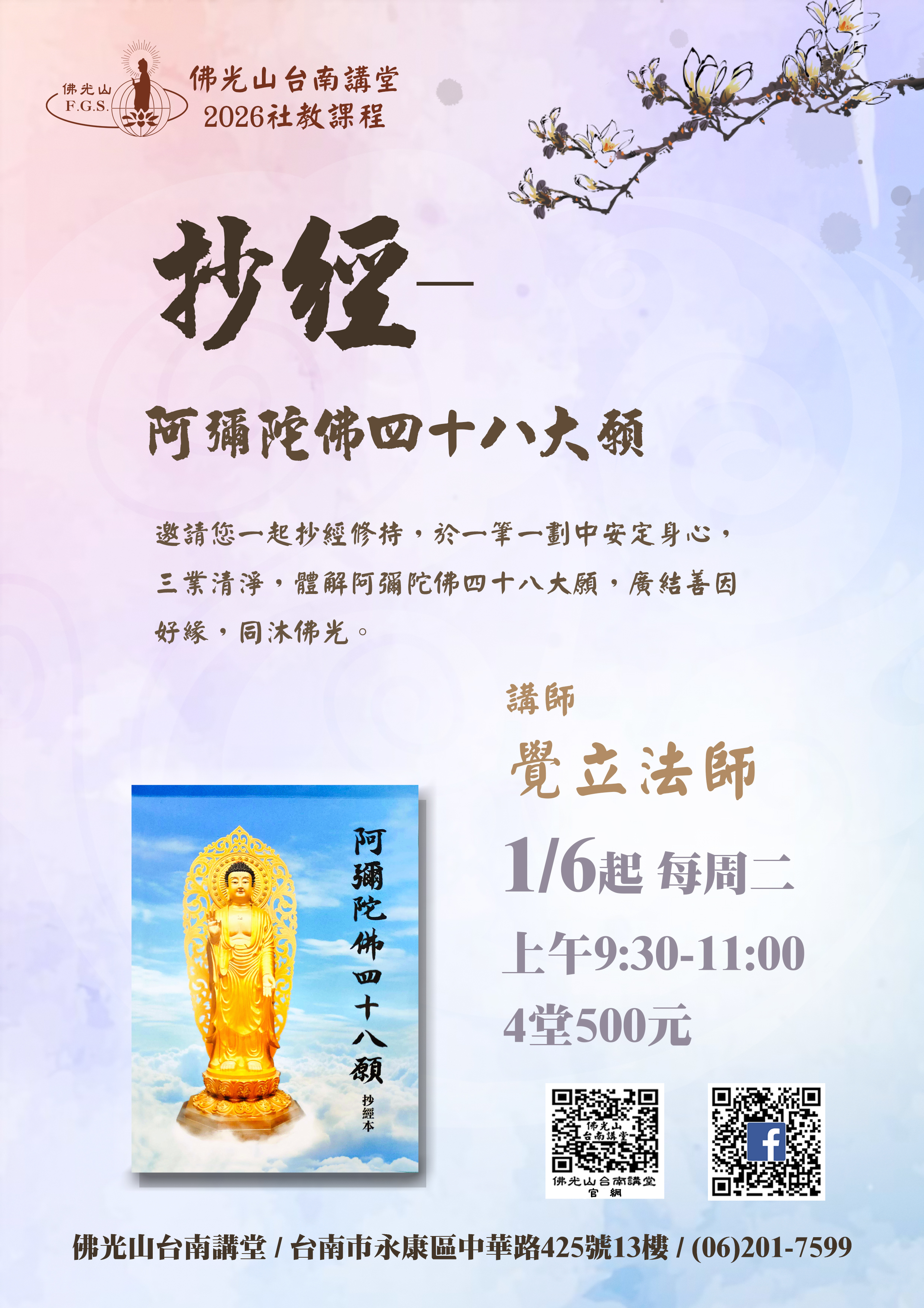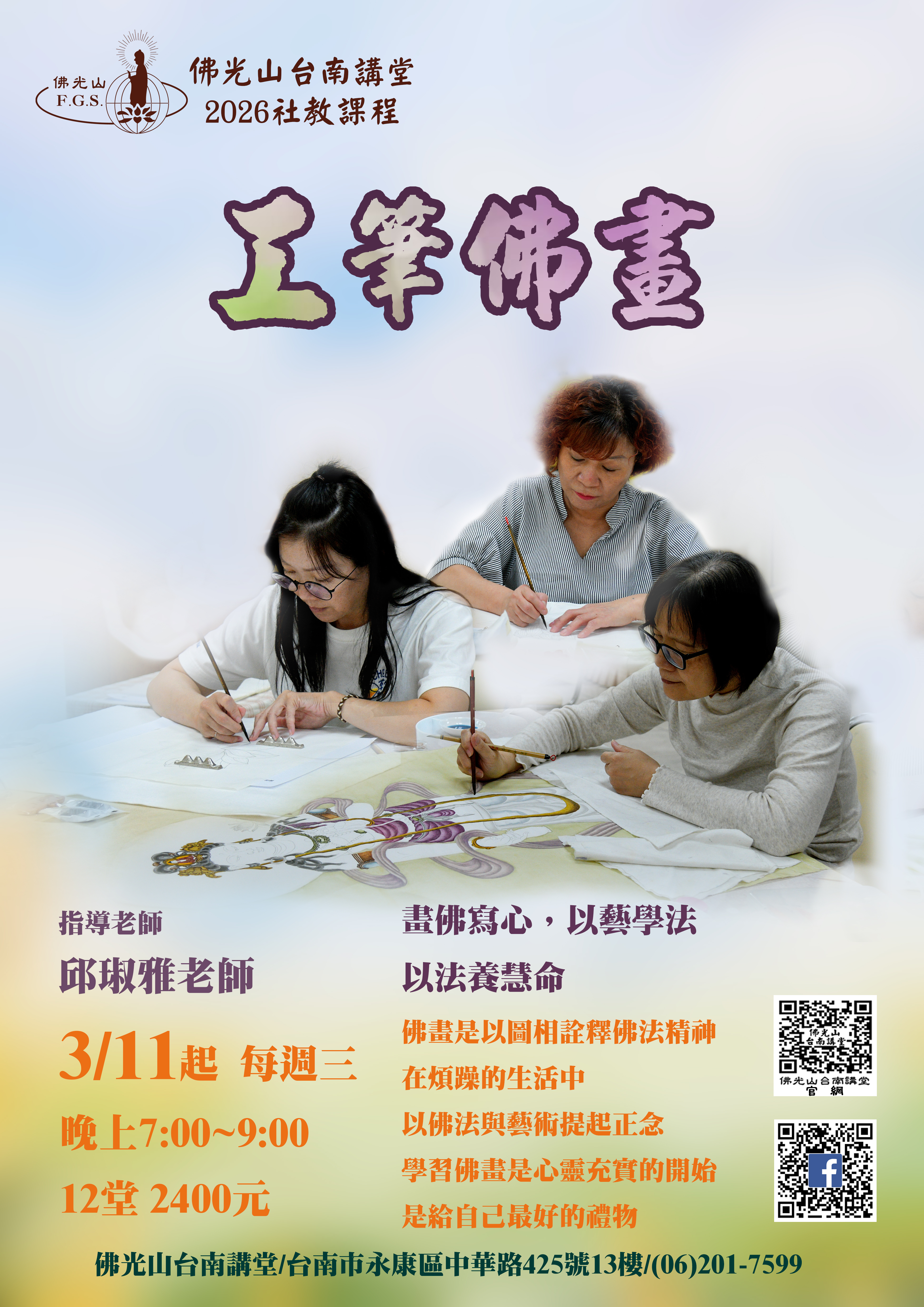 最新活動首頁了解更多最新活動 2025/07/27 posted2025秋寒社教課程招生中2025/12/15 posted2026年初階書法班招生中2025/12/15 posted2026年工筆佛畫班招生中2025/12/15 posted2026年成人書法班招生中2025/12/13 posted頌缽靜心 寒假班招生中2025/12/03 posted抄經-阿彌陀佛四十八大願 招生中2025/11/13 posted12/28撥筋保健 單堂課招生中2025/10/22 posted8週經絡脈輪能量瑜珈 招生中2025/10/20 posted抄經《心經》班招生中2025/09/05 posted2025年秋季班 敦煌禪舞 招生中2025/08/14 posted遠距教學 佛說阿彌陀經 要釋 招生中2025/07/27 posted9/5陶藝手作 秋季班招生中2025/07/23 posted10/2 人間生活禪 招生中2025/07/22 posted10/18 正念茶禪 招生中2025/07/22 posted9/26頌缽靜心 招生中2025/05/31 posted台南佛光童軍團 招生中2025/03/11 posted2025年大台南區三皈五戒開始報名了!2025/03/11 posted2025年3月17日書瀹茶禪招生中2025/03/15 posted3/22 佛光有愛 邀您捐血 回首頁