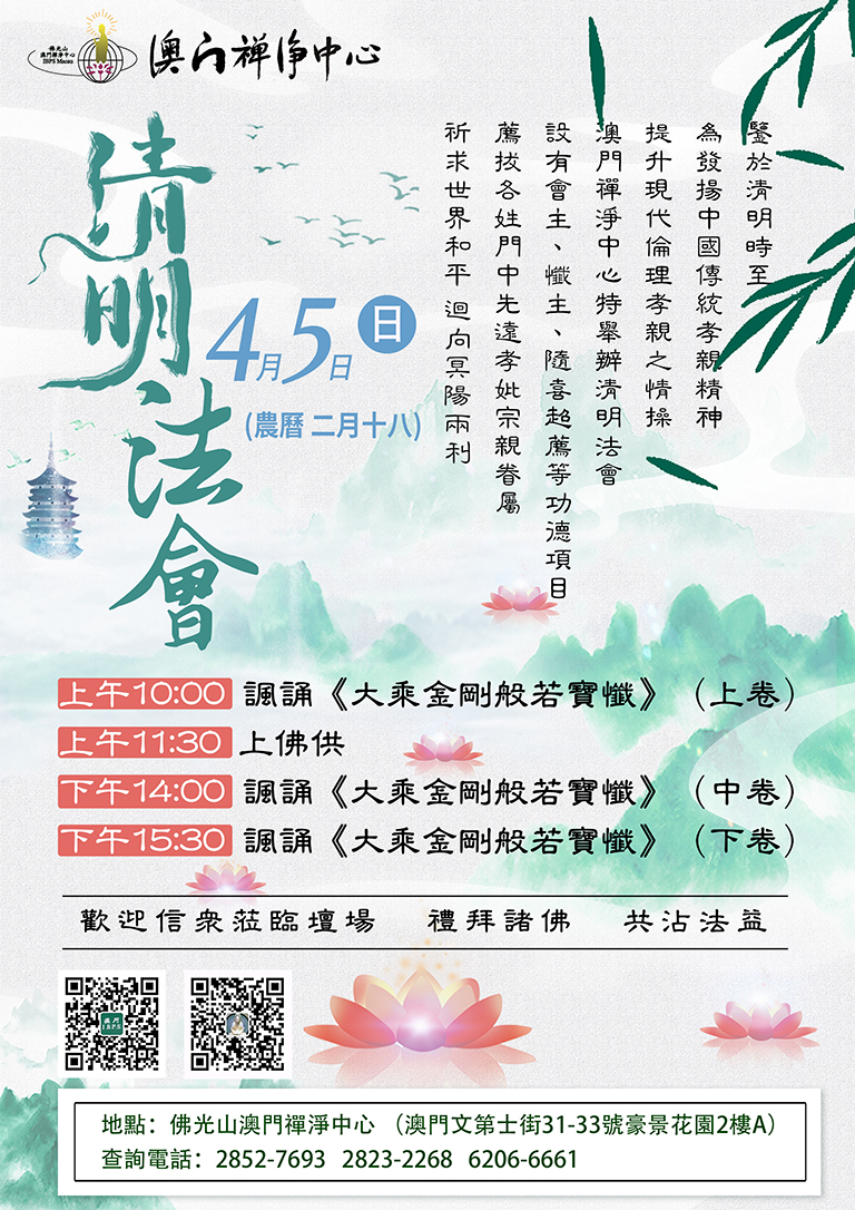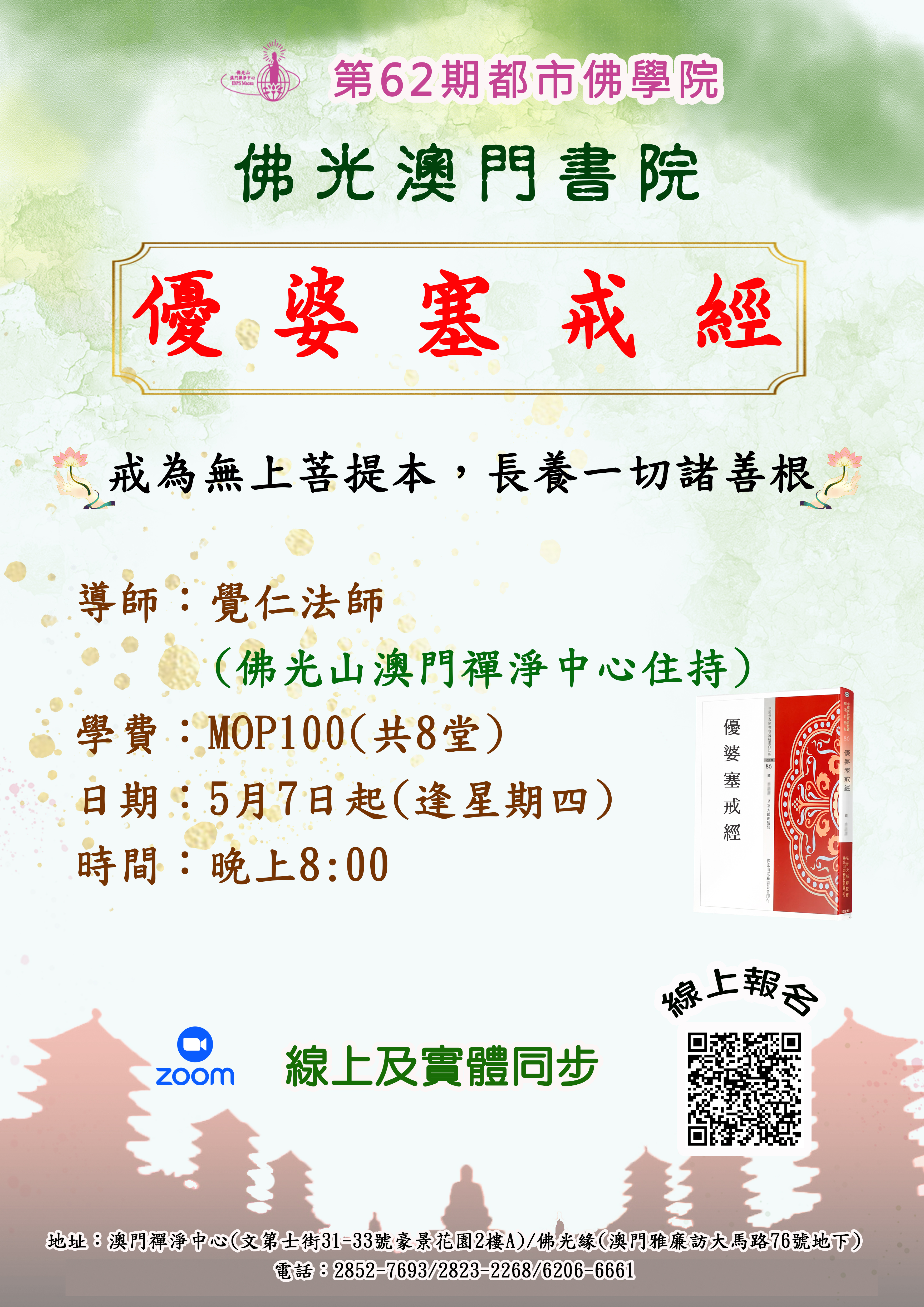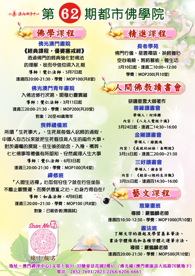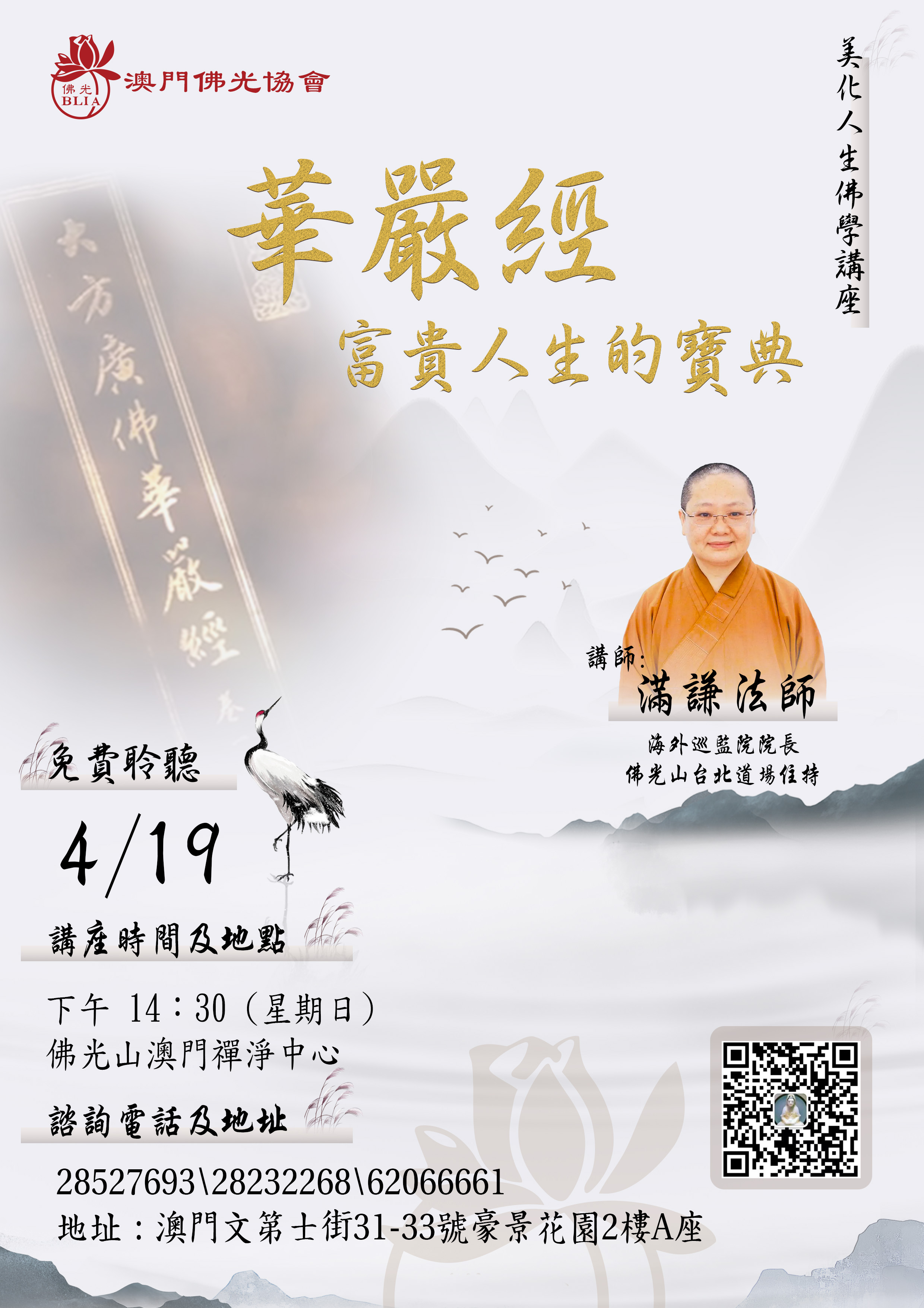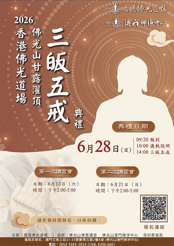 最新活動首頁了解更多最新活動 2025/12/30 posted佛光山開山60周年暨開山祖師星雲大師百歲誕辰【傳燈六十 百年仰望】心經修持活動2026/04/03 posted大悲懺暨光明燈法會2026/04/01 posted2026佛光山甘露灌頂三皈五戒典禮2026/03/24 posted【美化人生佛學講座】華嚴經‧富貴人生的寶典2026/03/12 posted【第62期都市佛學院】佛光澳門書院 ~ 優婆塞戒經2026/03/04 posted【法會通啟】孝親報恩清明法會2026/01/25 posted第62期都市佛學院各項課程招生中 回首頁