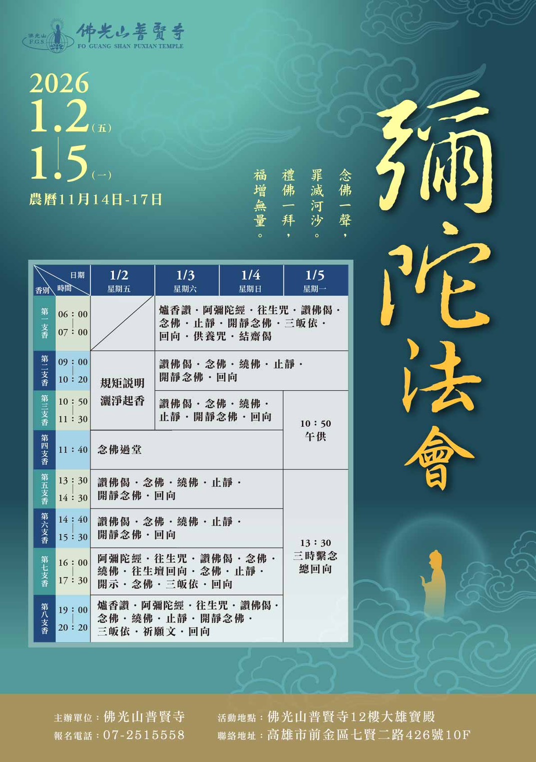 活動回顧首頁活動訊息近期活動活動回顧 回顧年表: 2025202420232022202120202019 2025/12/27 posted普賢寺2026年彌陀法會1/2農11/14(五)-1/5農11/17(一)上午9:00至下午8:202025/12/18 posted楊明仁博士【人醫】新書發表會12/21(日)下午14:50~15:502025/11/23 posted普賢寺2025年12月份人間佛教系列講座12/14(日)下午2時(請13:20~13:50報到入席)2025/11/10 posted普賢寺2025年藥師法會11/13(四)~11/15(六)2025/10/28 posted普賢寺2025年11月份人間佛教系列講座11/9(日) 下午2時(13:20~13:50報到入席)2025/10/10 posted普賢寺2025年10月份人間佛教系列講座10/26(六)下午2時(13:20~13:50報到入席)2025/09/18 posted普賢寺2025年10~12月行事曆2025/09/18 posted普賢寺2025年9月份人間佛教系列講座9/27(六)下午14:00(13:20~13:50報到入席) 1234
