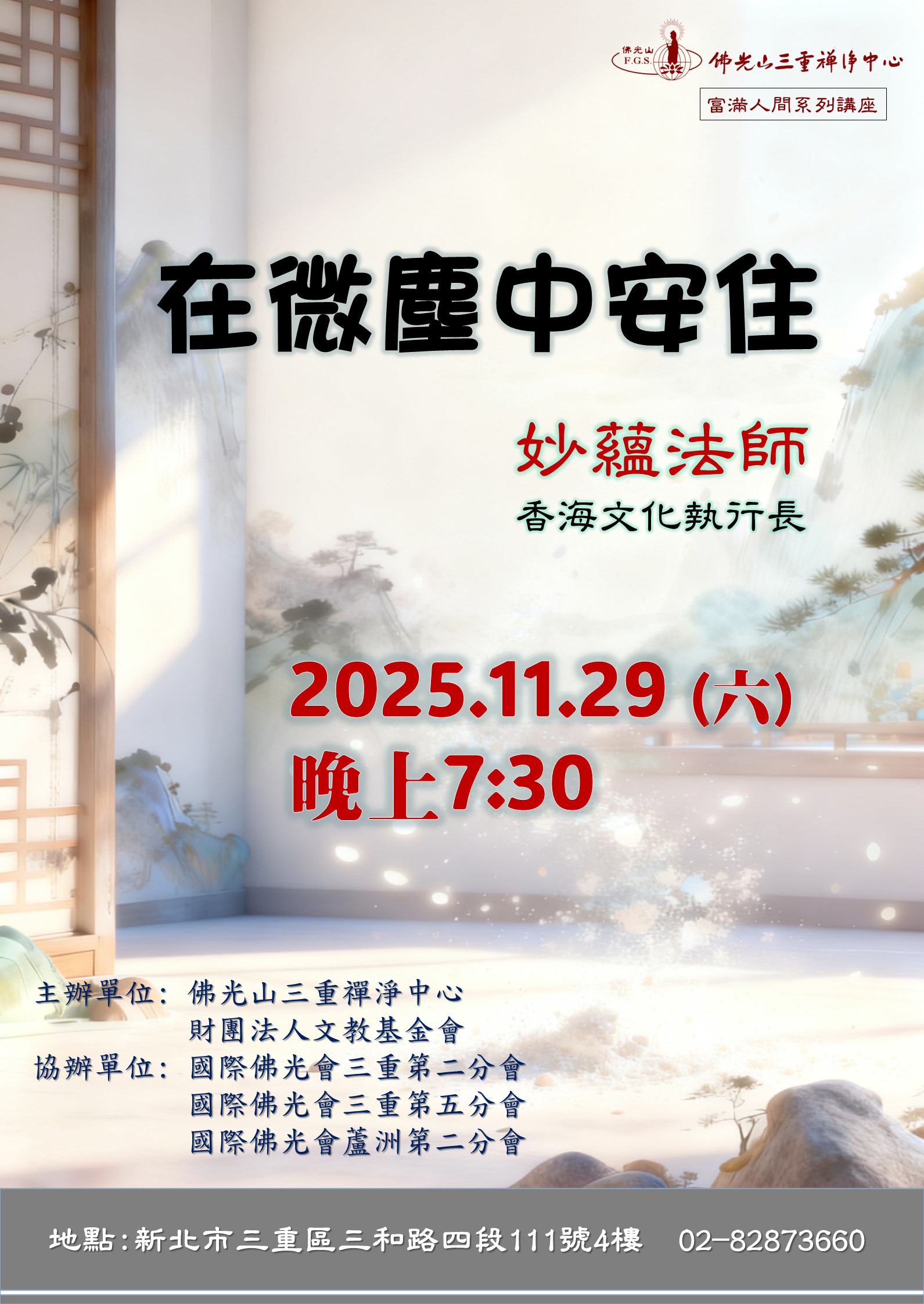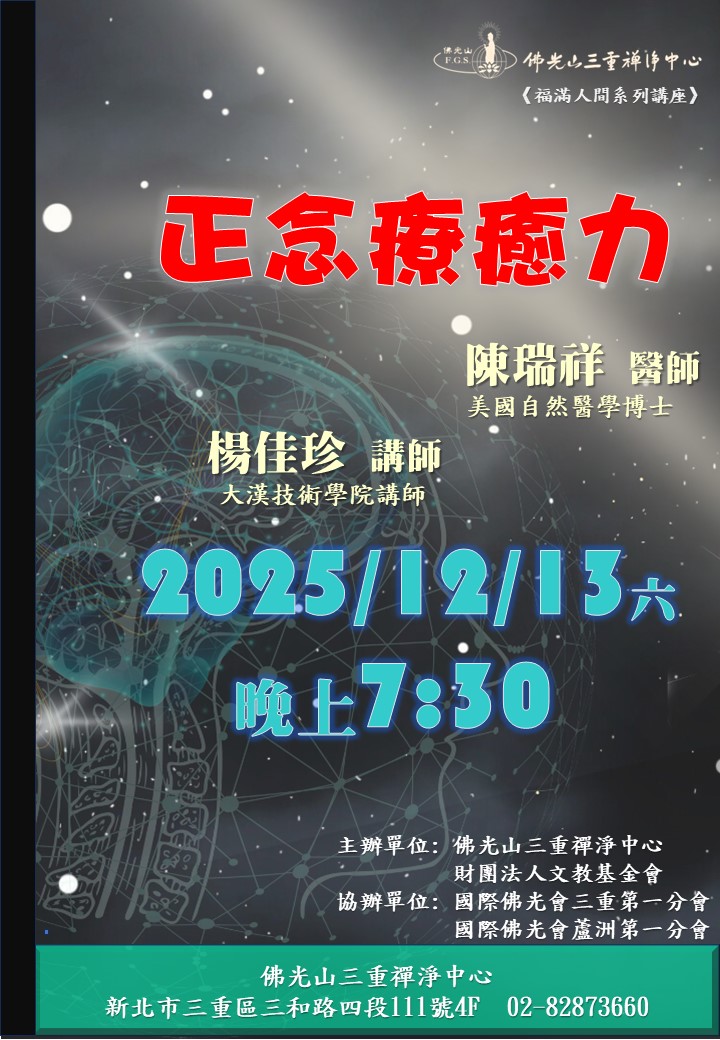 活動回顧首頁活動訊息近期活動活動回顧 回顧年表: 202520242023202220212020 2025/12/02 posted健康講座 - 正念療癒力2025/11/26 posted佛學講座 - 在微塵中安住2025/11/19 posted佛學講座 - 在微塵中安住2025/07/29 posted八關齋戒2025/04/25 posted佛光寶寶/兒童祝福禮2025/04/25 posted佛誕暨母親節蔬素食博覽會2025/03/31 posted一起同樂 微笑前行2025/03/24 posted2025 清明孝親報恩梁皇法會 1
