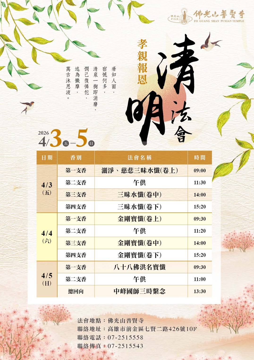 法會訊息首頁了解更多法會訊息 2026/03/10 posted普賢寺孝親報恩清明法會 日期:4/3(五農2/16)-4/5(日農2/17)2026/02/24 posted普賢寺念佛共修《阿彌陀經》3/21(星期六) 下午2時2026/02/24 posted普賢寺三時繫念法會 3/28(星期六) 下午2時 1