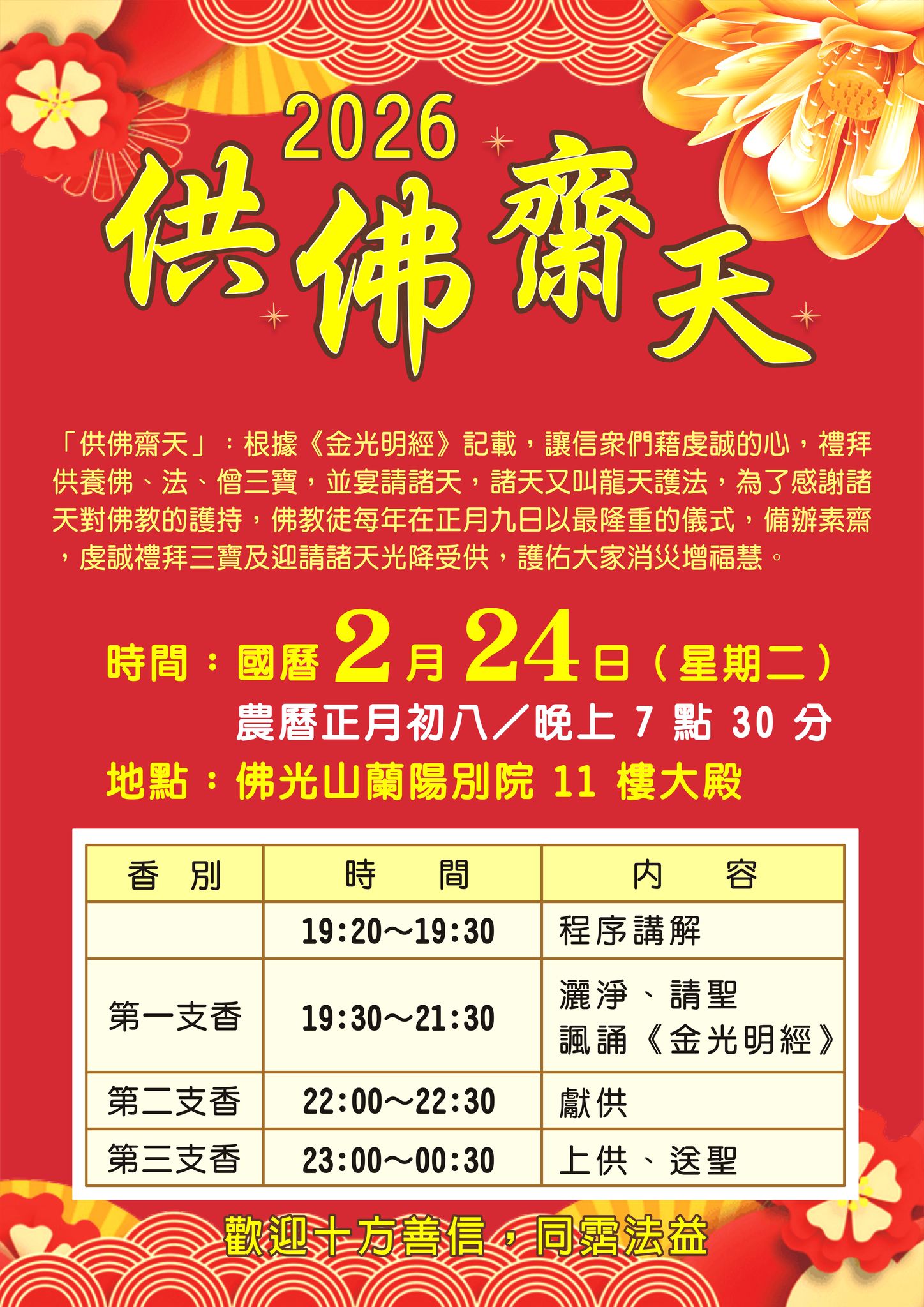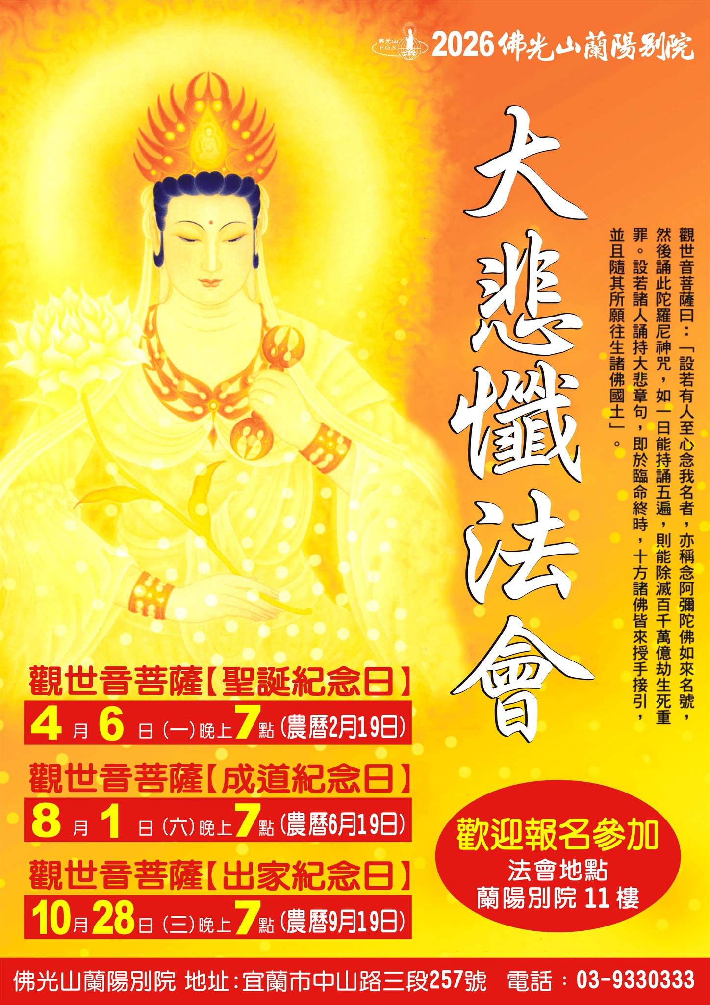 法會訊息首頁了解更多法會訊息 2026/02/02 posted2026年 大悲懺法會2026/02/02 posted2026年 光明燈開始登記2026/02/02 posted2026供佛齋天法會2025/10/01 posted消災法會2025/10/01 posted慈悲三昧水懺法會 1