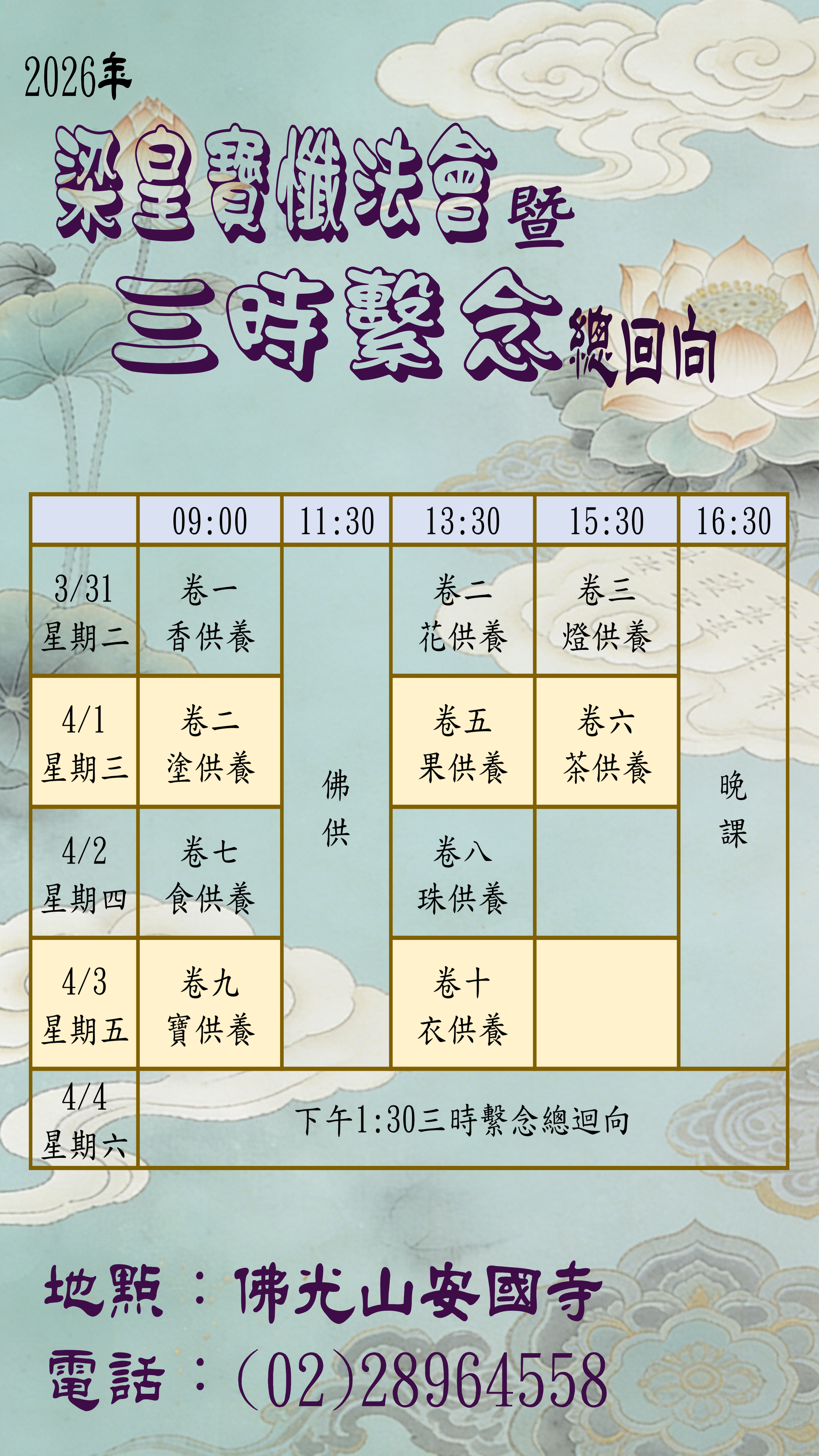 法會訊息首頁了解更多法會訊息 2025/12/26 posted藥師寶懺法會2026/02/14 posted觀音法會2026/02/14 posted朝山2026/02/13 posted清明梁皇法會2025/12/26 posted慈悲三昧水懺法會2025/12/26 posted消災法會2025/12/26 posted報恩法會 1