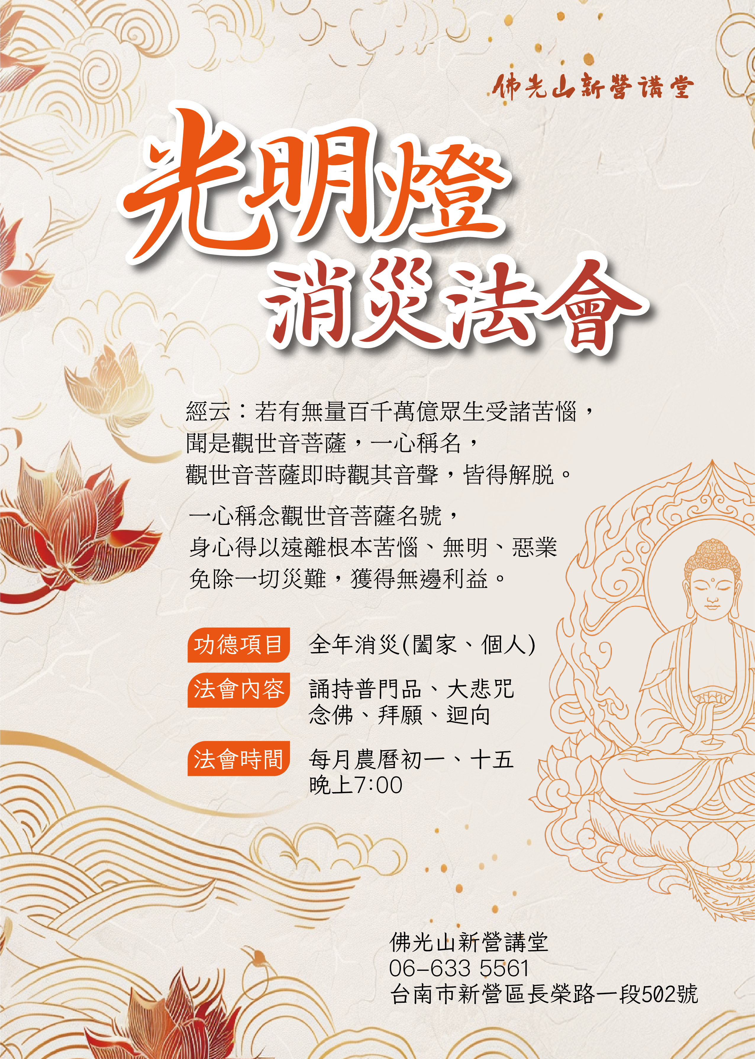 法會訊息首頁了解更多法會訊息 2025/12/09 posted2026年光明燈2025/05/13 posted共修法會2025/05/07 posted共修法會2025/04/01 posted光明燈消災法會2025/12/09 posted每月初一十五光明燈消災法會2025/11/17 posted2026年彌陀法會 1