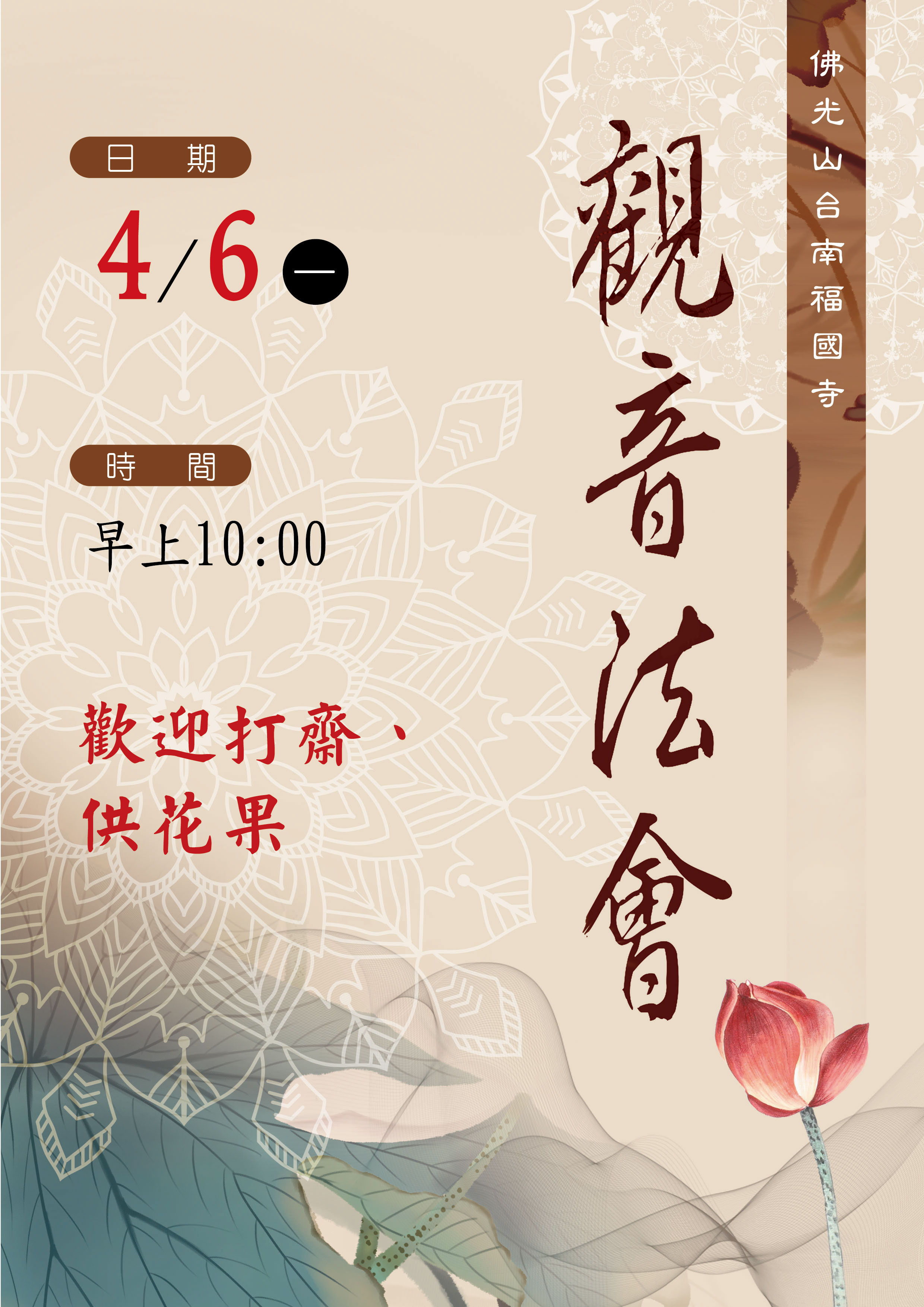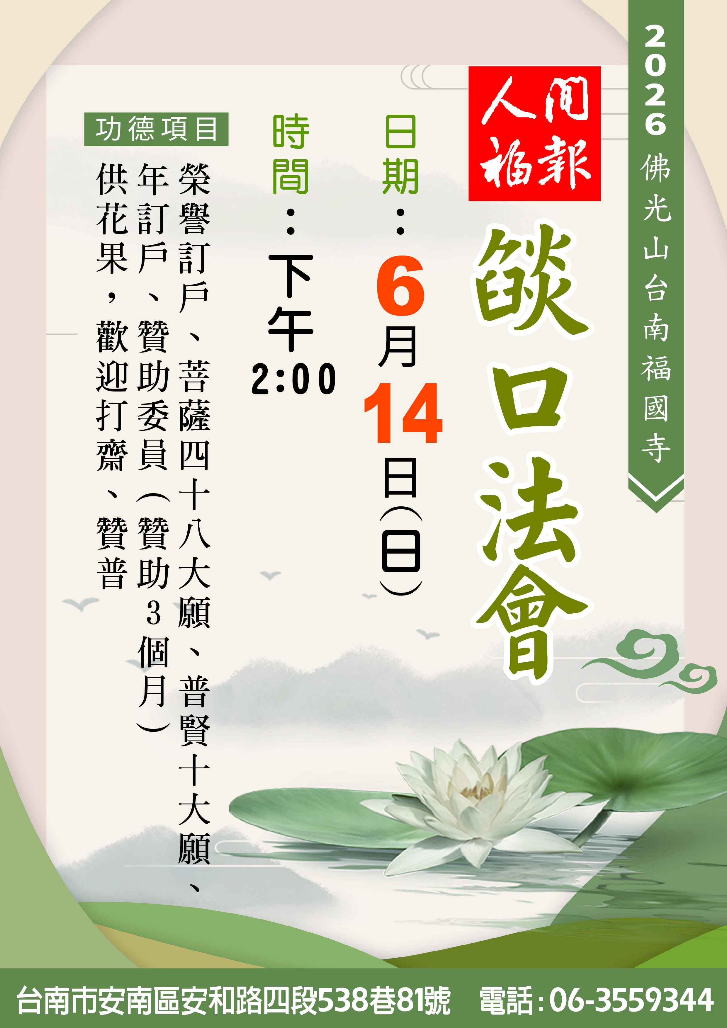 年度法會首頁法會修持年度法會 2026/03/01 posted20260406觀音法會2025/12/17 posted2026清明法會&修持2026/03/24 posted20260524 浴佛法會2026/03/24 posted20260614 人間福報燄口法會 1