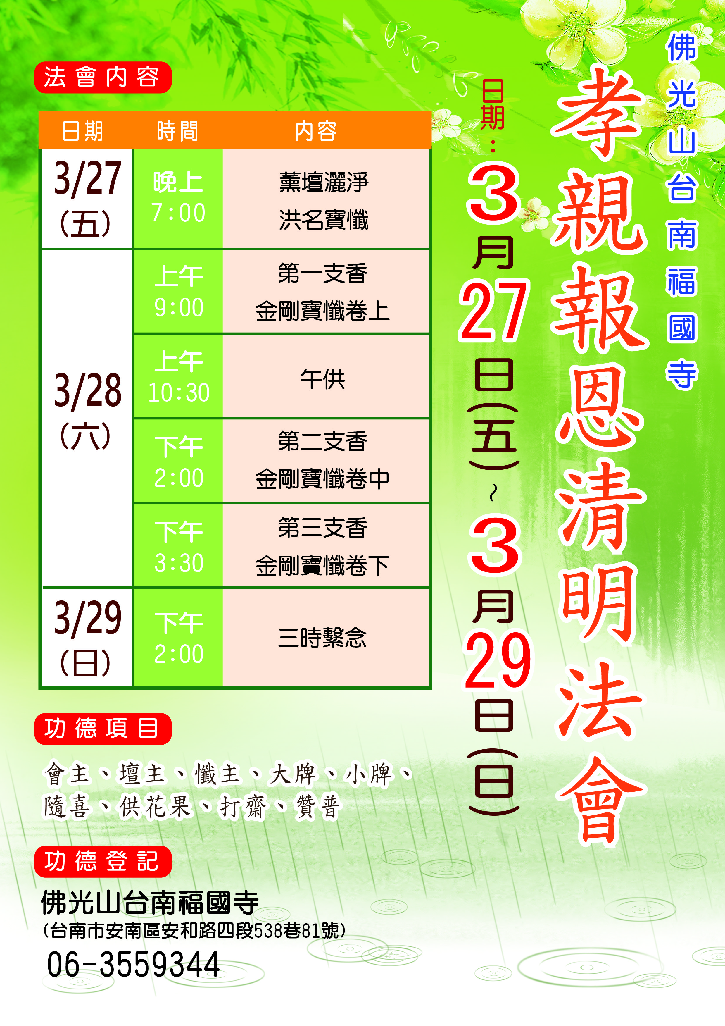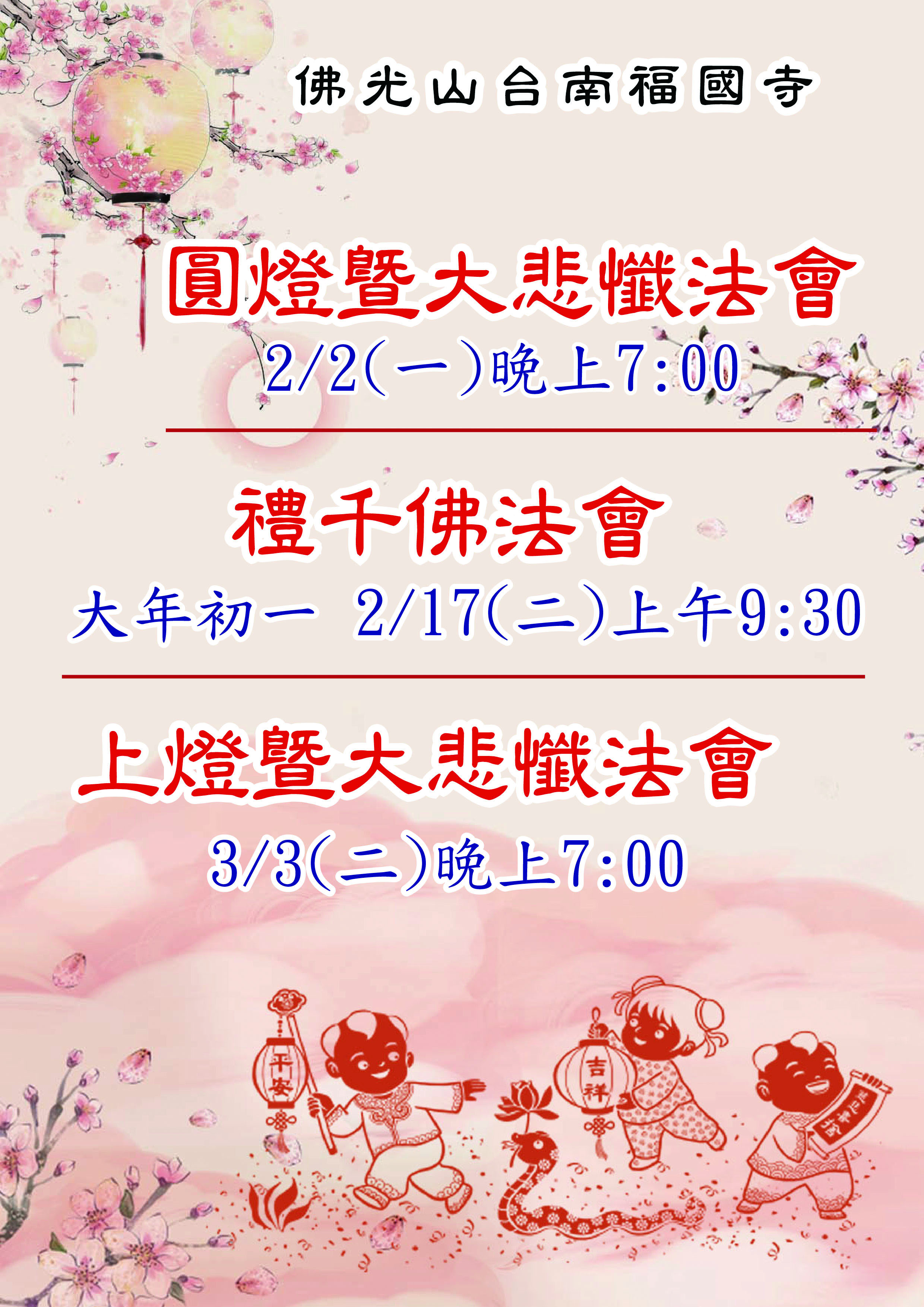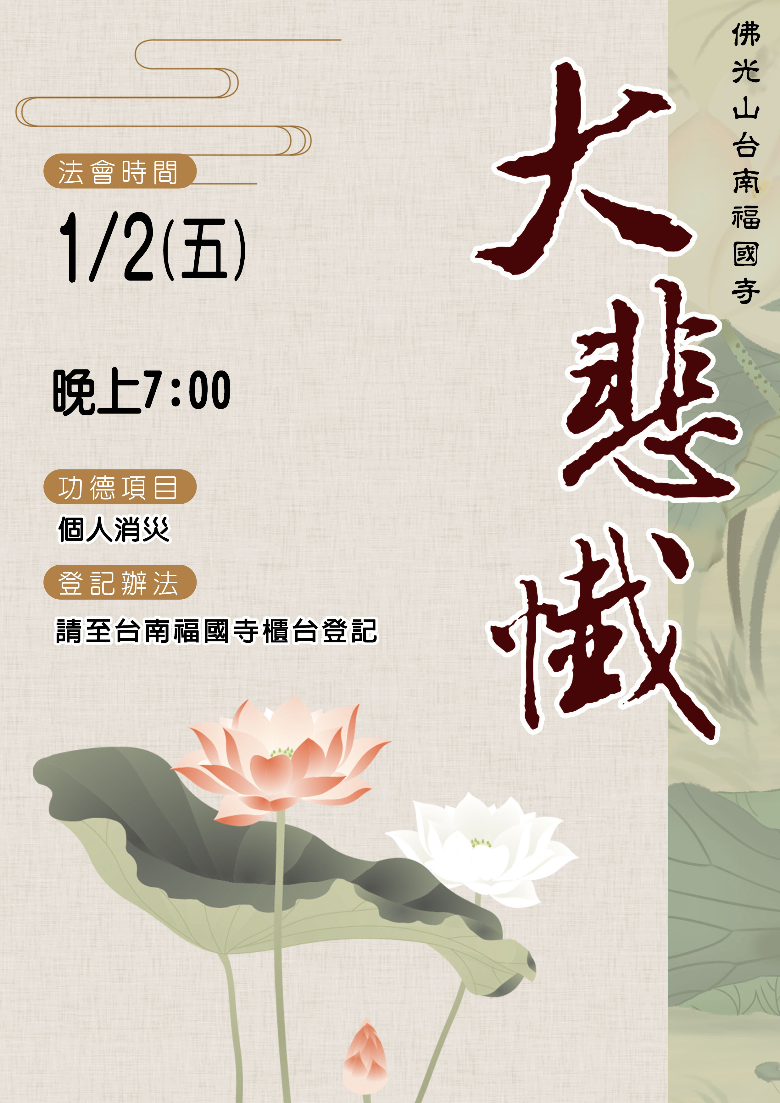 法會訊息首頁了解更多法會訊息 2025/12/17 posted2026新春禮千佛2025/09/20 posted2025年10-12月例行法會2025/12/20 posted跨年叩鐘祈福法會2025/12/17 posted2026年01-02月例行法會2025/12/17 posted2026清明法會&修持2025/10/02 posted2026/1/3-1/5彌陀法會 1
