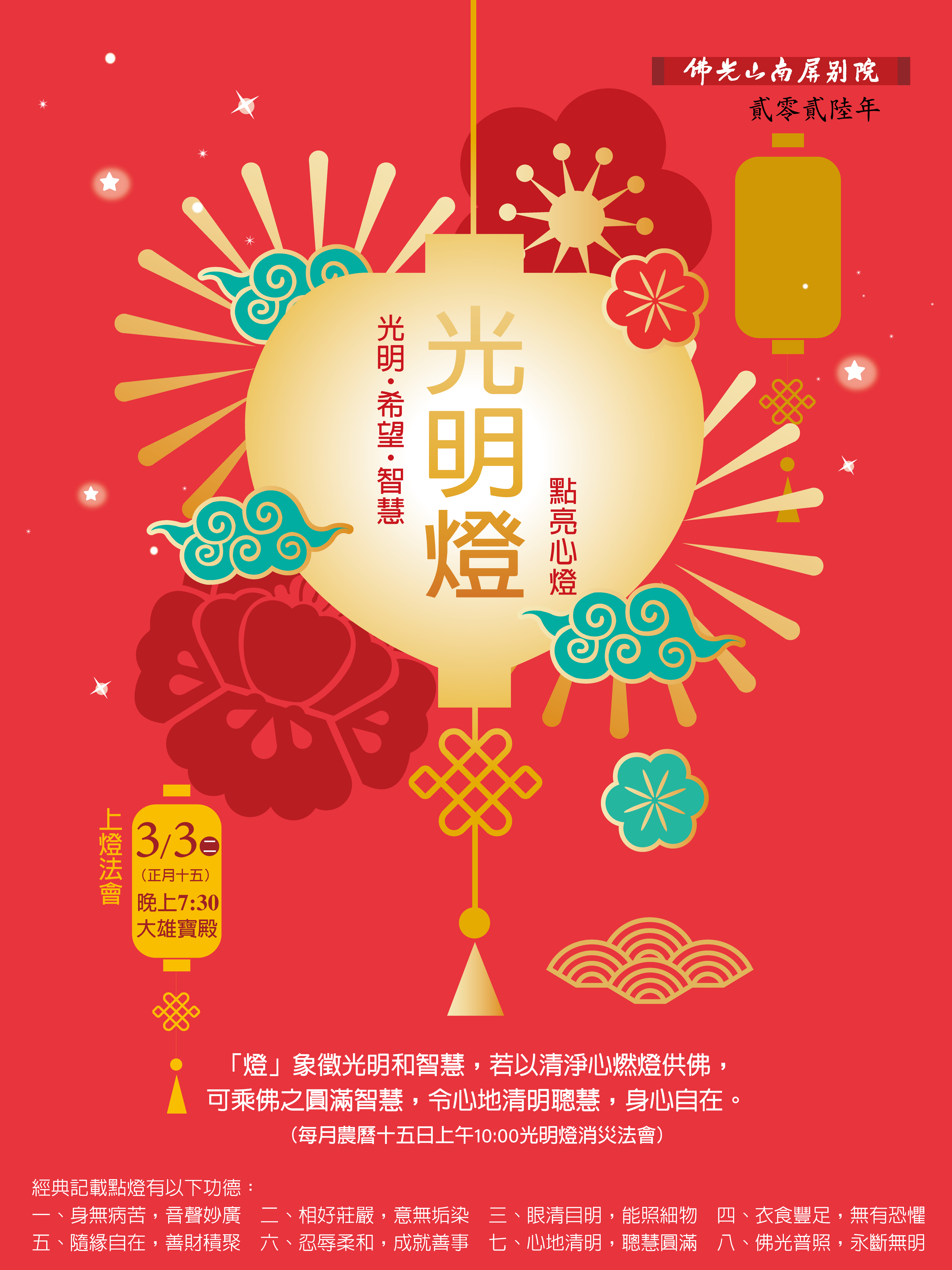 年度法會首頁法會修持年度法會 2026/01/16 posted【2026新春供佛齋天法會】2/24(初八)-2/25(初九)2026/01/15 posted【新春大悲懺法會】🌟2/20(初四) - 2/21(初五)2026/01/14 posted2026光明燈.上燈法會🌟3/3(二)晚上7:302025/11/20 posted【2025🔸彌陀佛七法會】2025/10/04 posted【2025🌿藥師法會】11/8(六)-11/15(六)✨2025/06/13 posted【2025💫孝道月祈安報恩法會】8/22(五)-9/7(日)啟建,敬邀大眾蒞寺參加✨2025/02/25 posted【2025⭐清明梁皇法會】 1
