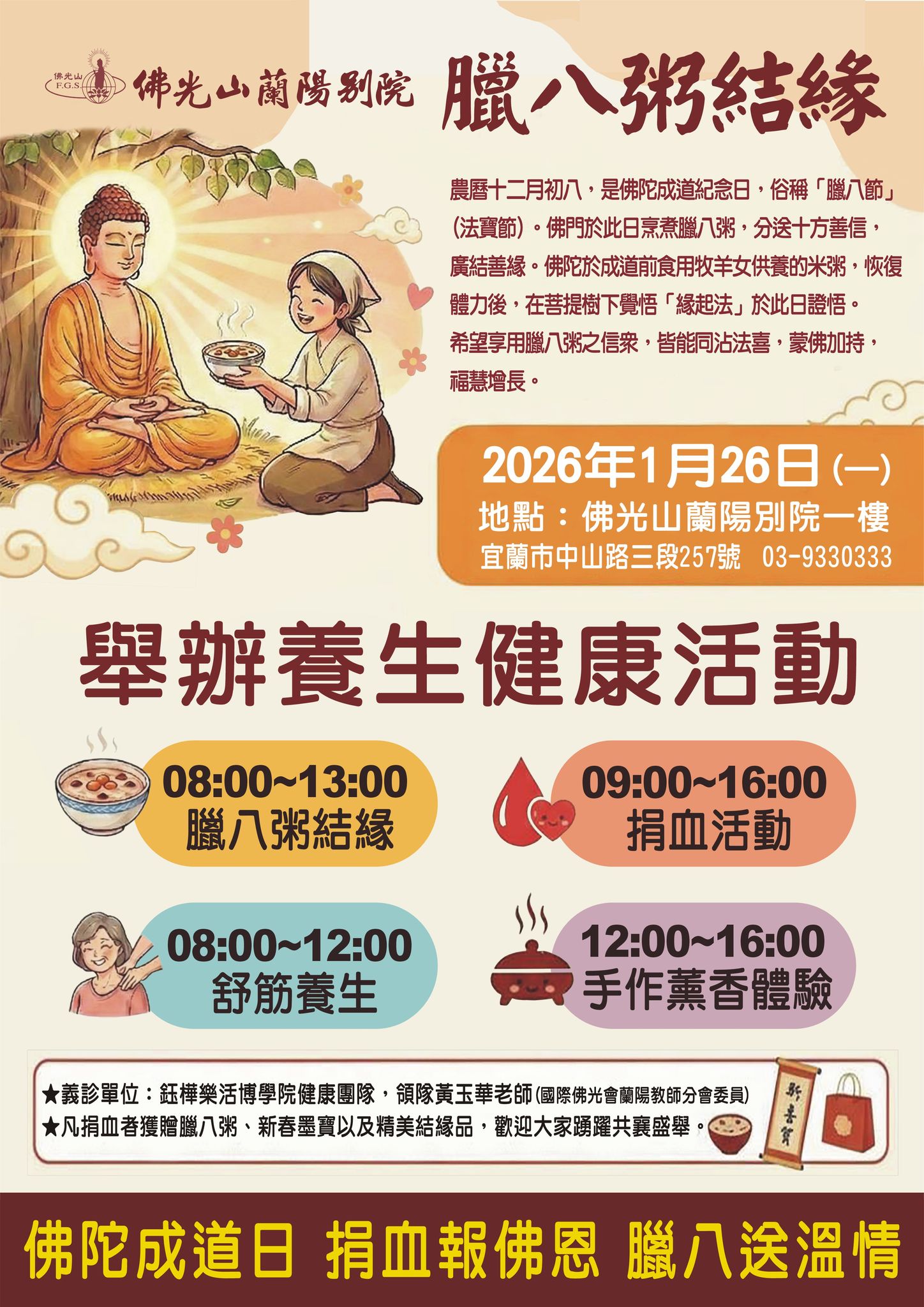 日 期|2026 年 1 月 26 日(星期一)地 點|佛光山蘭陽別院地 址|宜蘭市中山路三段 257 號)活動內容與時間: • 08:00-13:00 腊八粥結緣 • 09:00-16:00 捐血活動 • 08:00-12:00 舒筋養生 • 12:00-16:00 手作薰香體驗凡捐血者,贈送腊八粥、新春墨寶及精美結緣品一份。洽詢電話|03-9330333誠摯邀請大眾共襄盛舉,歡喜結緣、健康迎春。