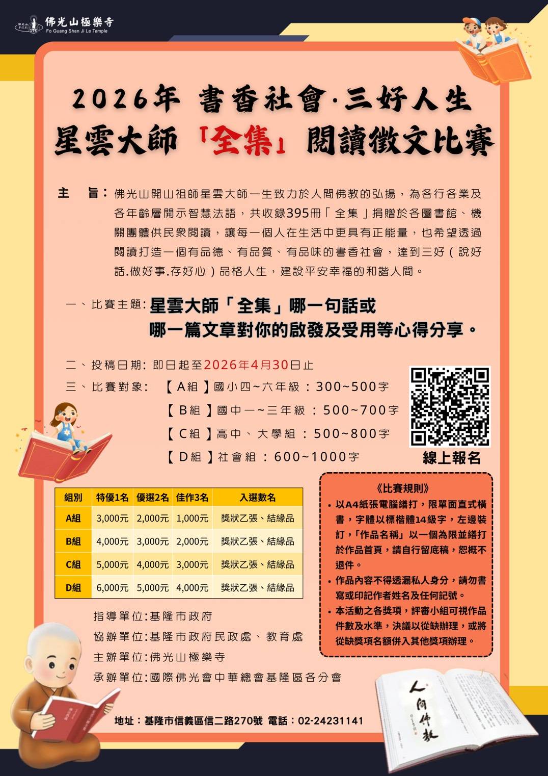 4.頒獎典禮: 2026年5月24日(日)下午二點,於極樂寺二樓 舉行。