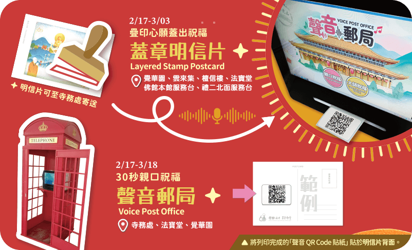 2/17(二) ~ 3/3(二) 覺華園、雲來集、檀信樓、法寶堂、佛館本館服務台、禮二北面服務台30秒親口說祝福 - 聲音郵局
