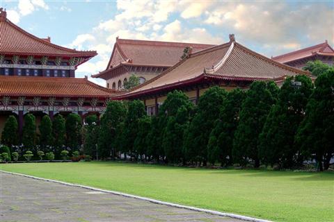 殿前的丹墀「成佛大道」佔地約千餘坪,可容納三萬人以上之聚會。「成佛大道」上舖有方型水泥塊,刻有優美線條,係佛光山大眾合力畫上。丹墀四周迴廊環繞,富麗莊嚴。