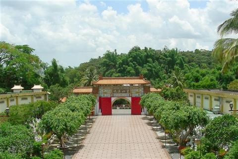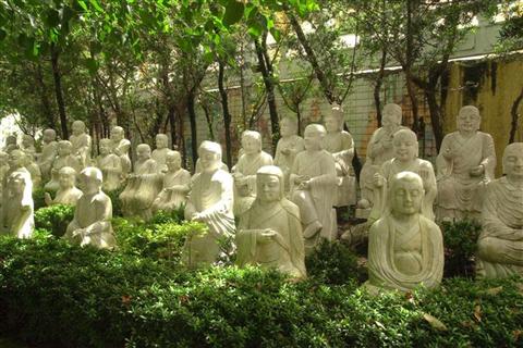 不二門後,五百尊白玉雕刻而成的阿羅漢,栩栩如生,每尊形貌、表情各異其趣,是佛光山的『靈山勝境』。 兩旁的菩提樹,枝葉婆娑,軀幹高聳入摩空,花草樹木,相映奇趣。