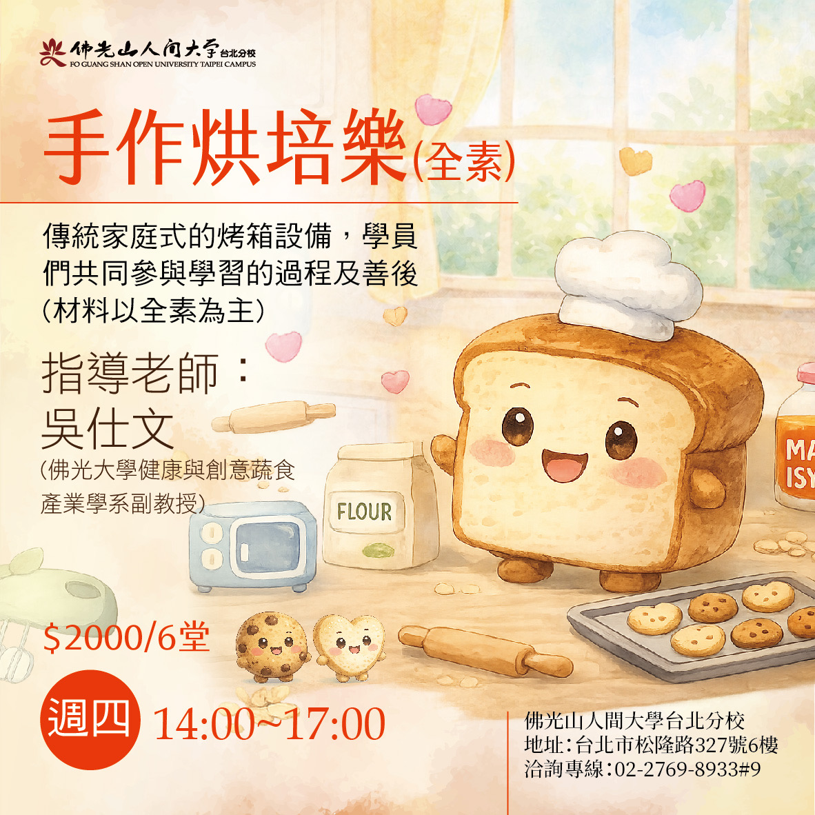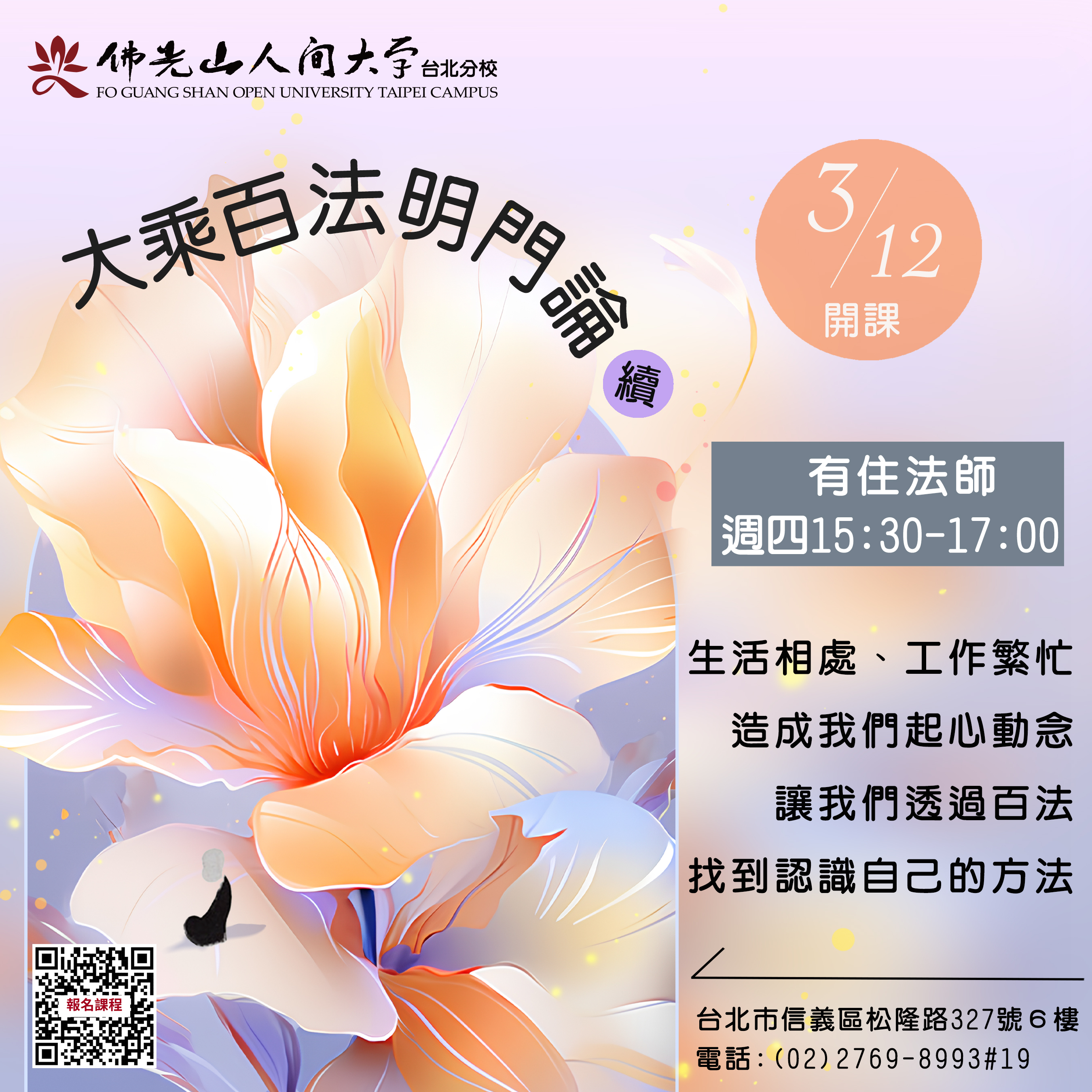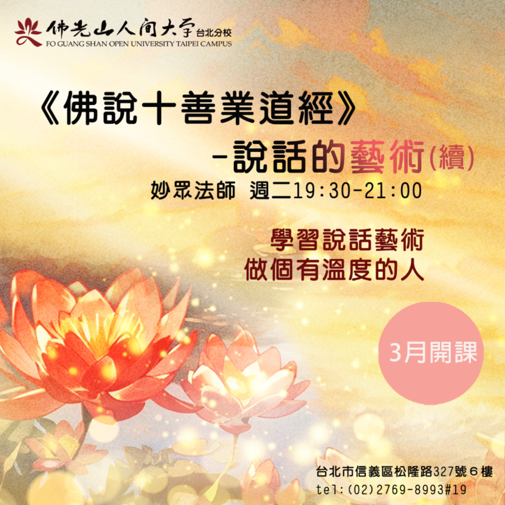 近期活動 首頁 活動訊息近期活動 2026/01/13 posted2026萬人三皈五戒2026/02/03 posted從佛經古德法語領悟人生2026/01/05 posted2026台北燈節佛光山燈區🏮2025/12/26 posted2026年人間大學台北分校春季課程開始報名囉2025/12/01 posted台北道場2026年01~03月行事曆2026/02/12 posted🍞【手作烘焙樂(全素)】2026/02/12 posted🌸【大乘百法明門論(續)】2026/02/11 posted跟上 AI 時代:入門零基礎2026/02/10 posted🪷【《佛說十善業道經》—說話的藝術(續)】2026/02/09 posted🎵【葫蘆絲・福祿斯】2026/02/08 posted【華嚴經・入法界品(續)】2026/02/07 posted慢慢學電腦(需自備筆電)2026/02/05 posted🌸【人文藝術.佛教造像千年之旅】2026/02/05 posted英語星樂園(國小生)2026/02/04 posted💫【人間佛教】《淨土經論選讀》|知光法師2026/02/03 posted💫【人間佛教】《佛陀遺教經典導讀》|妙傑法師2026/02/02 posted💫【人間佛教】《維摩詰經》人間歡喜修行法門|如禎法師2026/02/02 posted💫【人間佛教】認識我們真正的生命《六祖法寶壇經》|妙暢法師2026/02/02 posted💫【人間佛教】學佛行儀(基礎)|如化法師2026/01/30 posted💫【人間佛教】《圓覺經》幻化中的覺醒|妙毓法師2026/01/29 posted🔔【樂活人生.中醫經絡居家實務】2026/01/28 posted💫【人間佛教】 《從《阿含經》看見幸福》|慧寂法師2026/01/27 posted🤗【樂活人生.12時辰中西醫保健之道】2026/01/26 posted🌟【人間佛教・何處覓心安・成佛之道的信願行】2026/01/25 posted🌿 Chan Meditation: A Moment of Stillness in a Bus2026/01/24 posted🧘♂️【人間佛教・楞伽經的禪生活觀】2026/01/23 posted🖼️【人文藝術・老照片說故事--走讀星雲大師宜蘭弘法行】2026/01/21 posted🌸【人文藝術】千古跫音・禪繞阿含2026/01/20 posted慶祝佛光山60週年台北道場人間大學特別企劃 觀看活動回顧